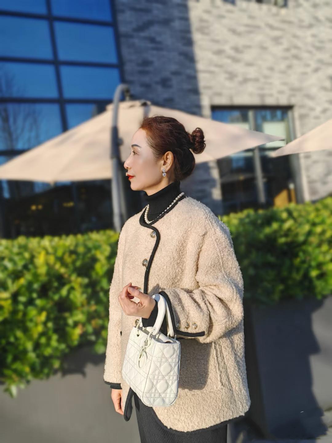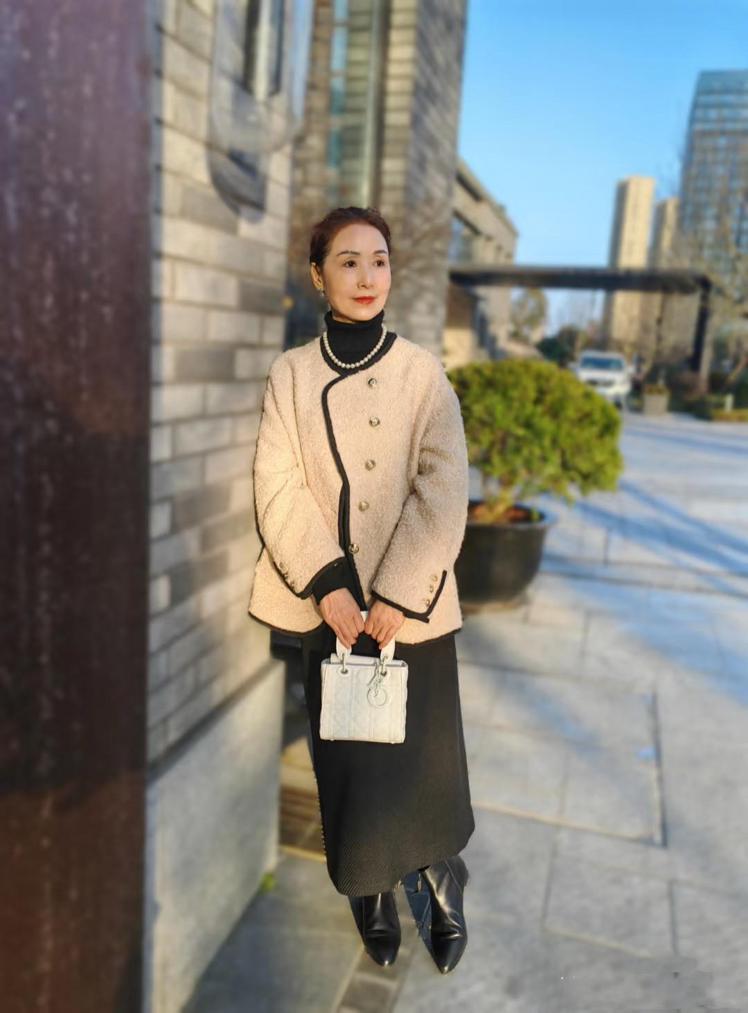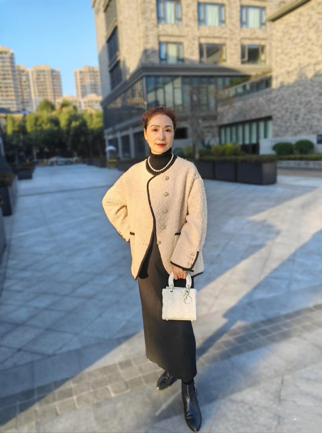小香風外套寬鬆版型、羊羔絨設計,保暖防風,初冬季節穿起來也很溫暖。穿着小香風外套的時候,阿姨挽起了長髮,扎一個丸子清爽減齡又顯氣質。