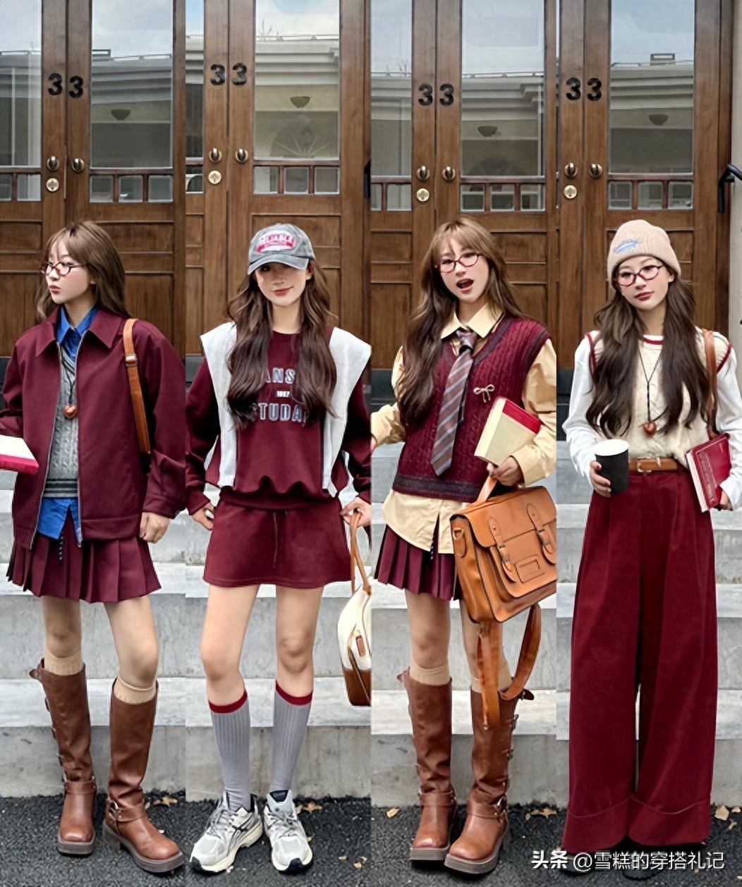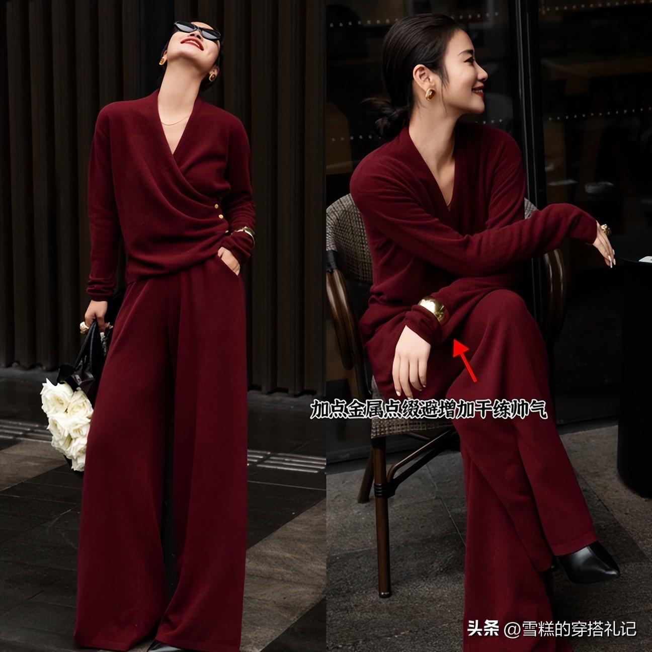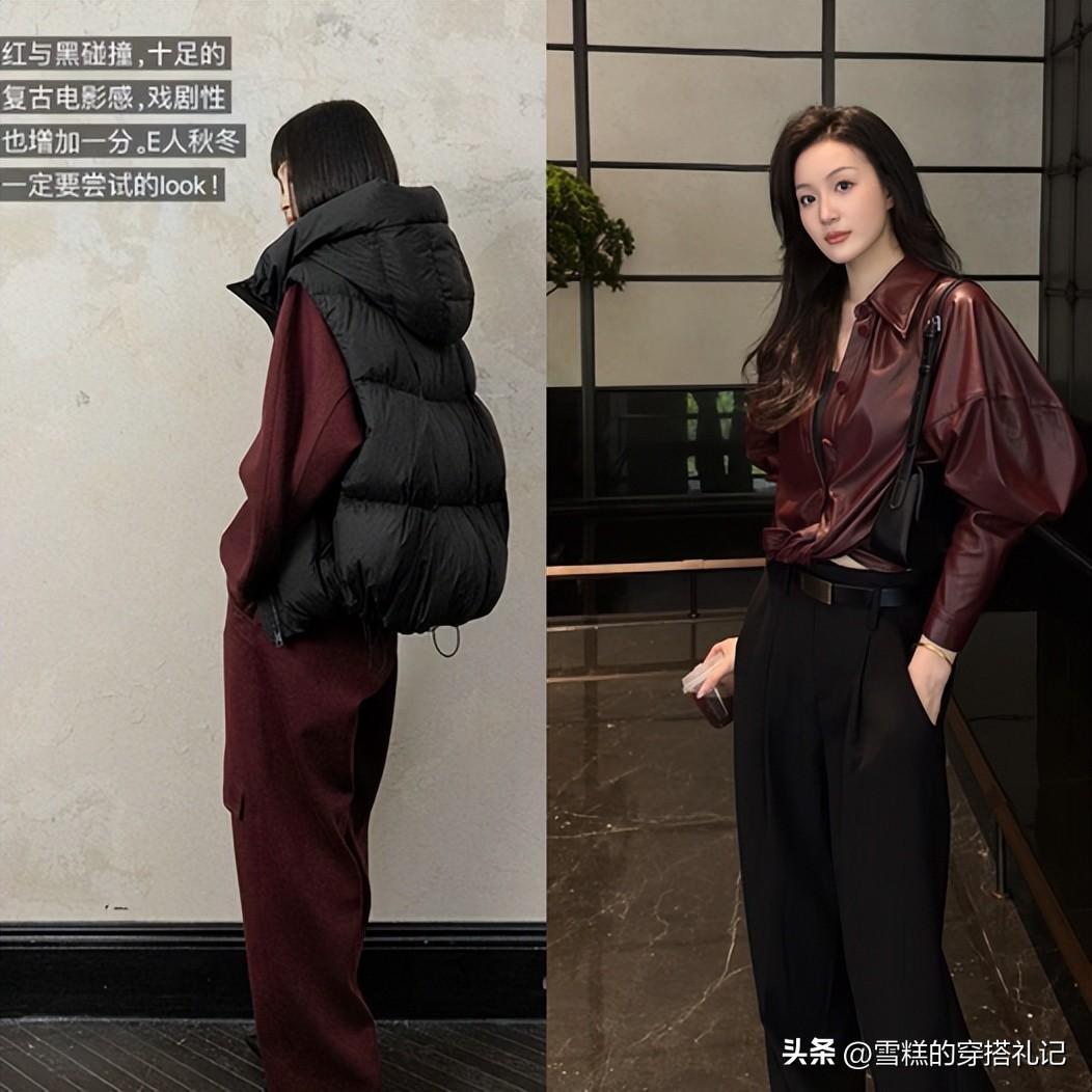 想要延續安可拉紅色的低調氣質,顏色選更深的色系,但是要避免顯老氣的款式,比如深棕、藏藍都不推薦,會降低整個傳達的高級,讓人看起來不年輕。最佳的顏色是與黑色組合,黑色自帶的帥氣感,增加了整套穿搭的氣質並且黑色有着最顯瘦的作用,搭配在一起能避免臃腫,是微胖女人的最佳選擇。