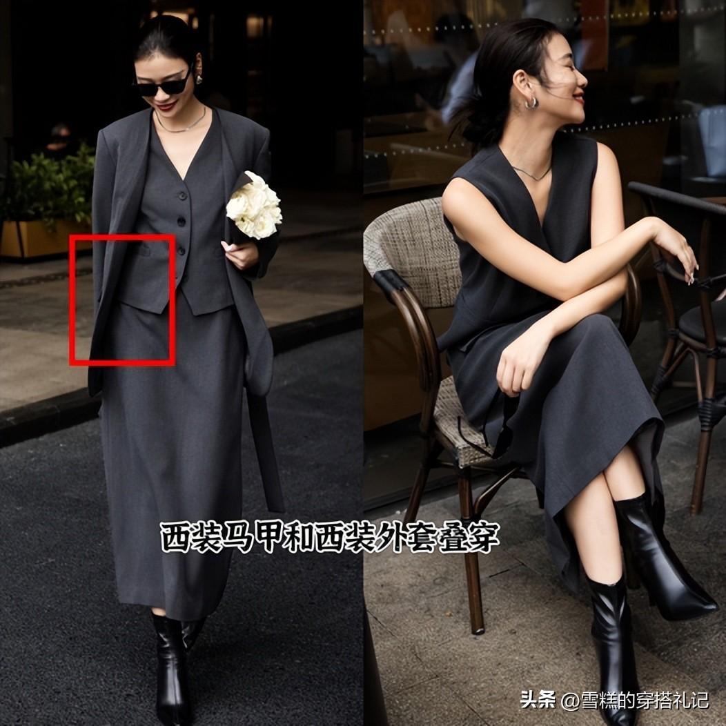 要將冷靜灰的距離與高級感發揮到極致,選西裝單品絕對沒錯,這兩者結合是最佳的黃金CP。西裝的線條裁剪明顯且有寬鬆度,上身就能達到顯瘦遮肉的效果,整個設計非常簡單,建議在搭配中採用疊穿來豐富衣服的層次,比如西裝外套和西裝馬甲的搭配。其次領口儘量形成v型的設計,多露膚增添整個穿搭的自然感,不會太生硬。