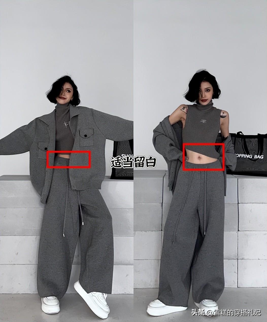 這種同色系的穿搭,對於穿搭小白來說很容易上手,其次不費吹灰之力就能get高級感的穿搭。不過冷靜灰的同色系搭配避免過於死板,要學會運用露膚的技巧,可以是手臂、脖頸、腰部露膚,這樣的穿搭纔是有呼吸感的。