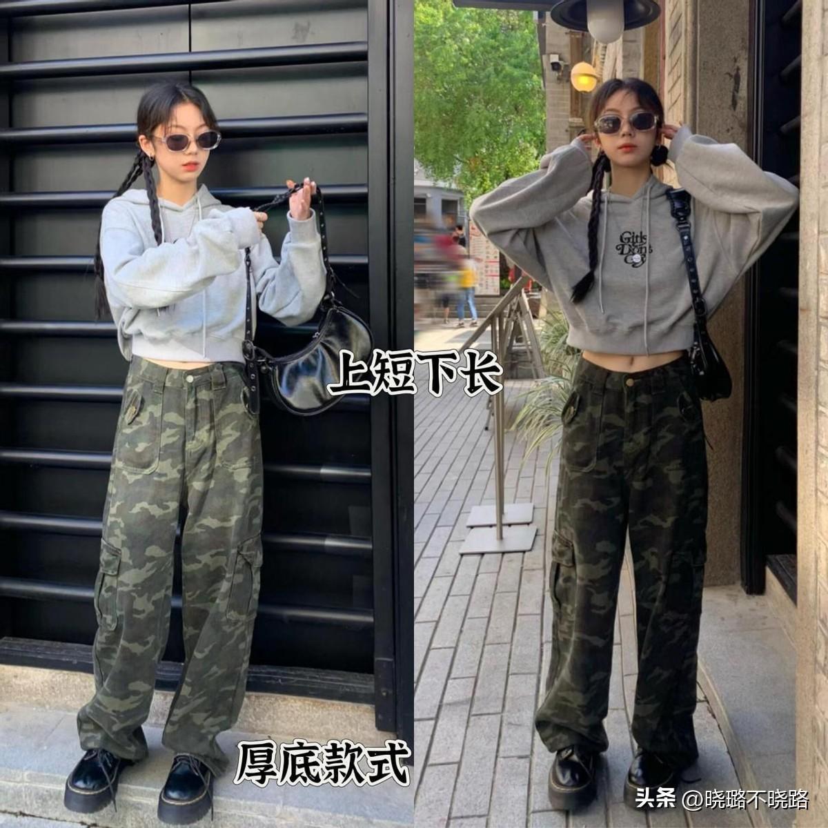 小個子千萬不要錯過“上短下長”的穿法,長度剛好露出肚臍的灰色連帽衛衣,搭配高腰款式的迷彩工裝褲,瞬間分割標準比例,而厚底款式的小皮鞋,也是增高的不二之選。