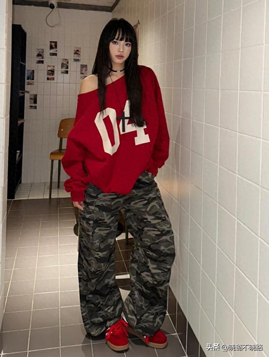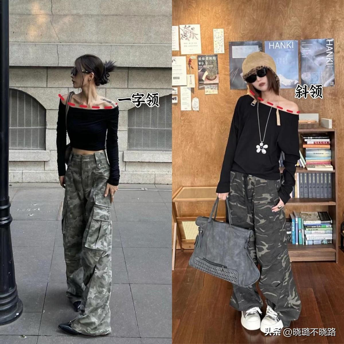 迷彩工裝褲是屬於比較中性風的單品,若你想要增添一絲小性感,建議可以入手一字領上衣,露出肩膀和鎖骨的位置,吸引力拉滿。
