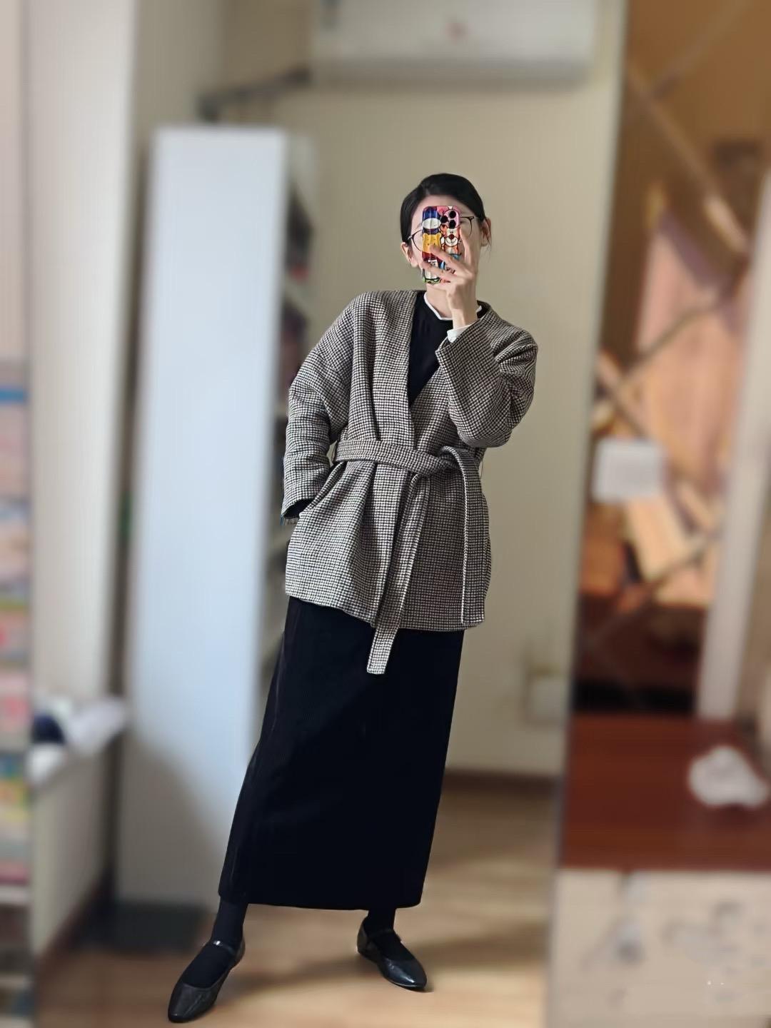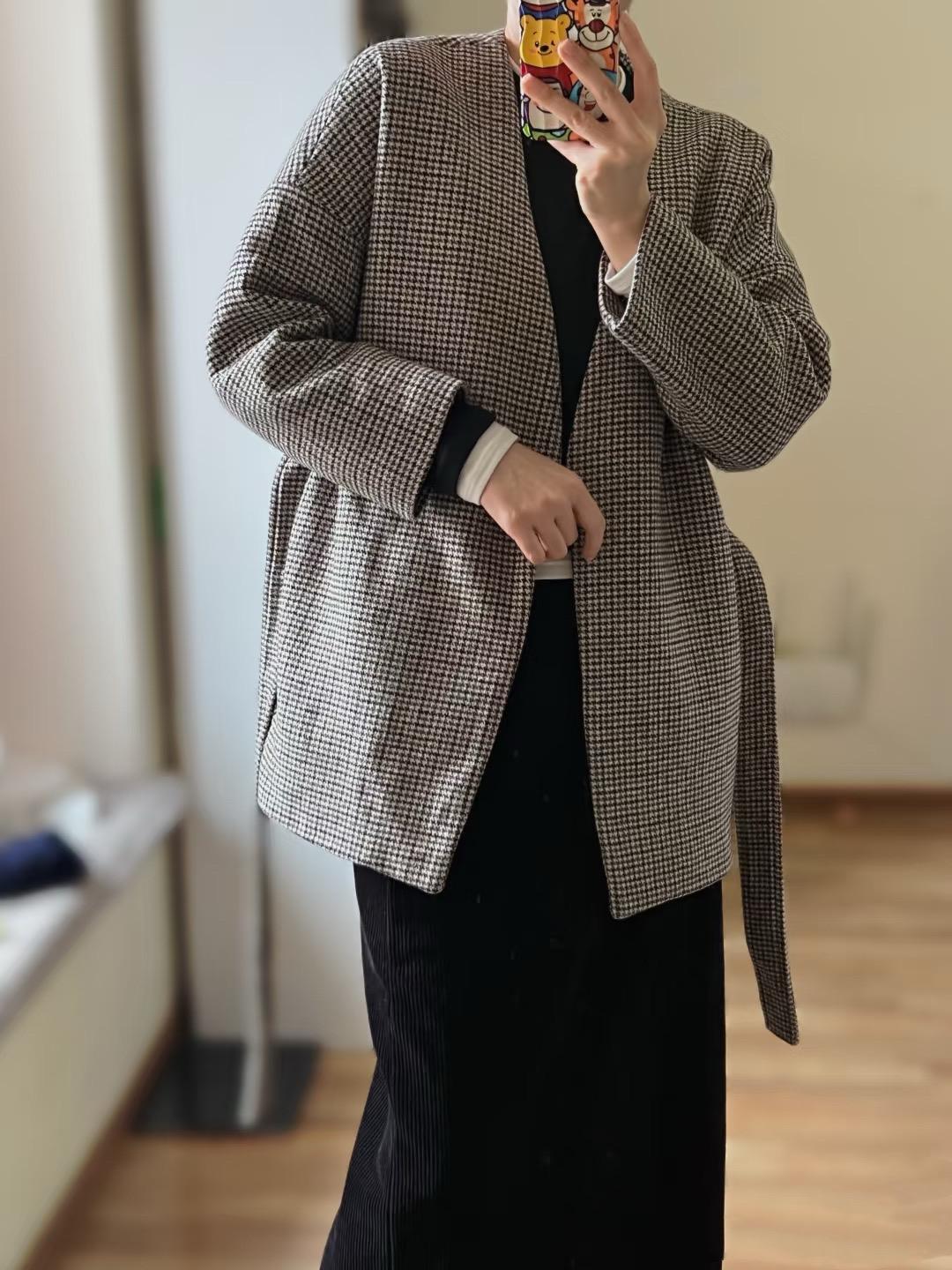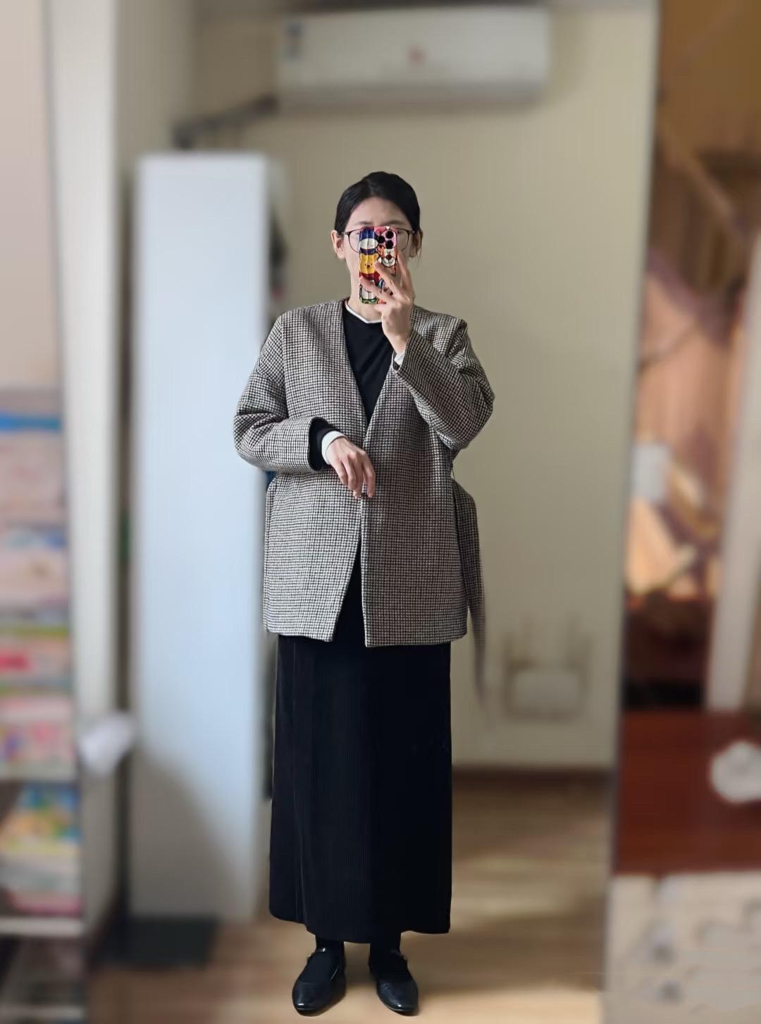 這件呢大衣,是有點復古的款式。很經典的千鳥格,不單調也不張揚。不管是上班、休閒、還是逛街、約會都可以穿。