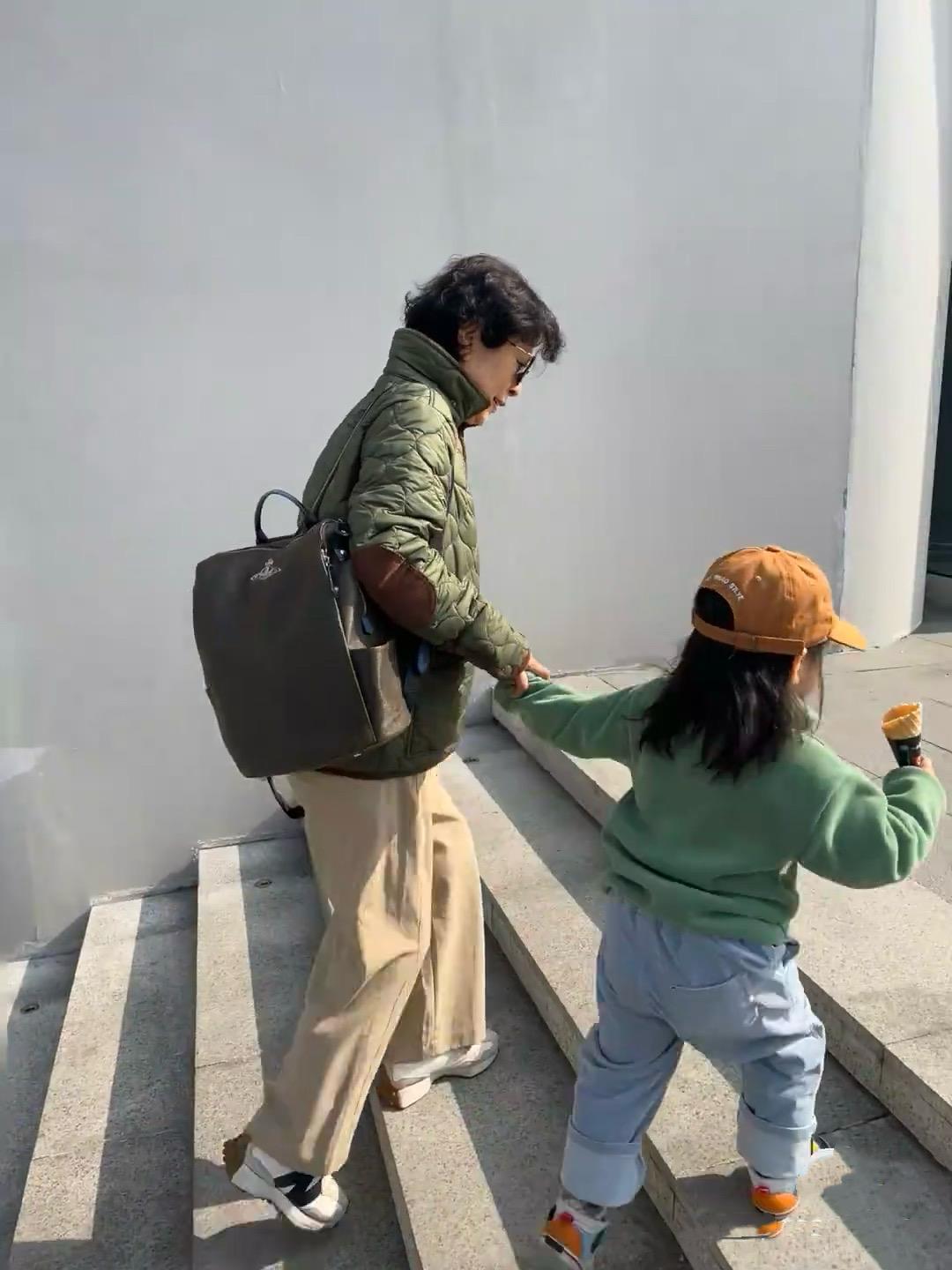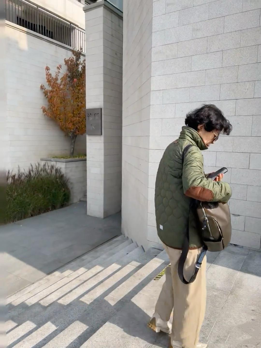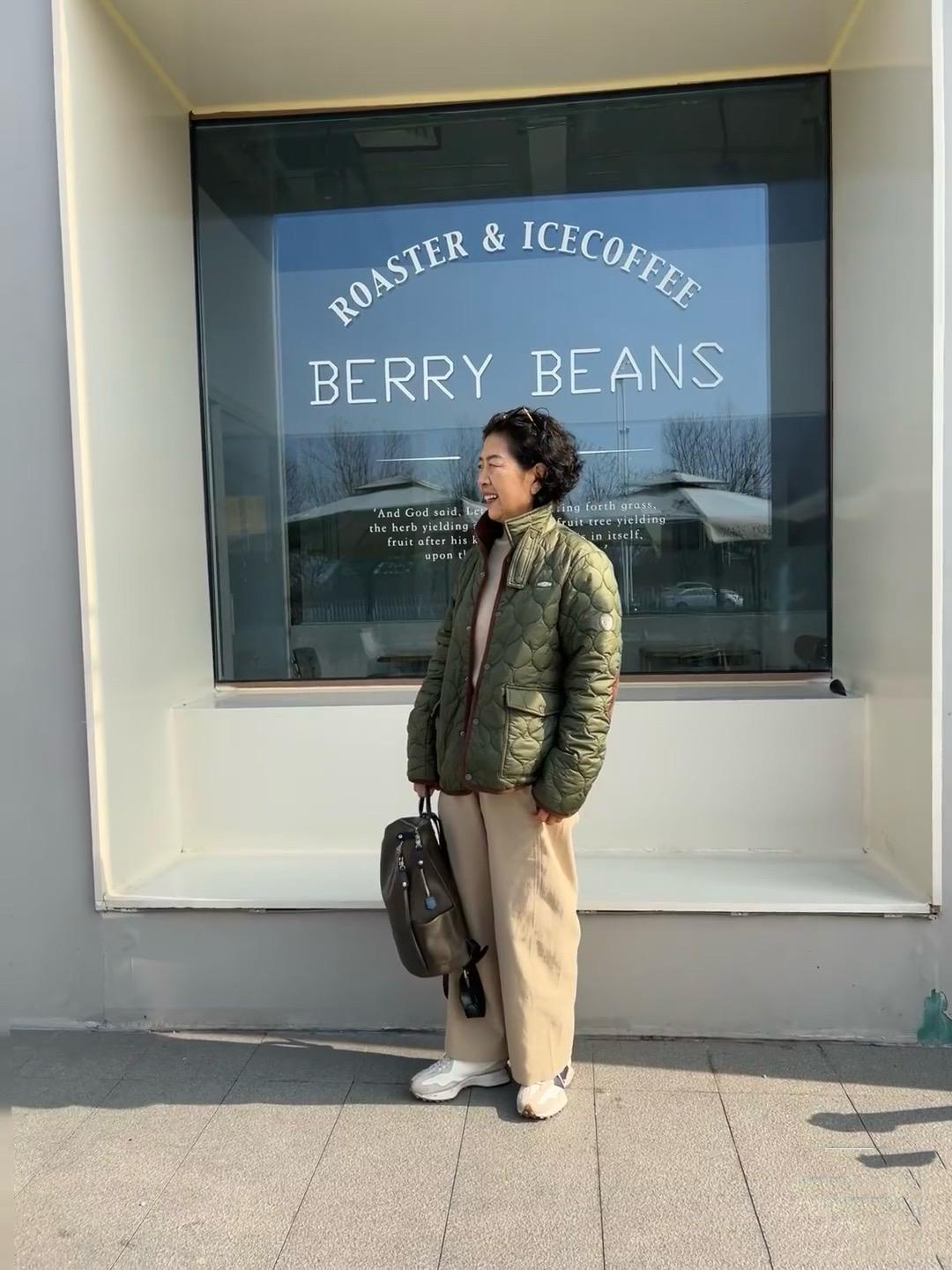 這樣的豎領絎縫羽絨服,也是非常容易搭配的。像我這個年紀的人,更加註重穿衣的舒適度,所以配了一條卡其色的直筒褲。