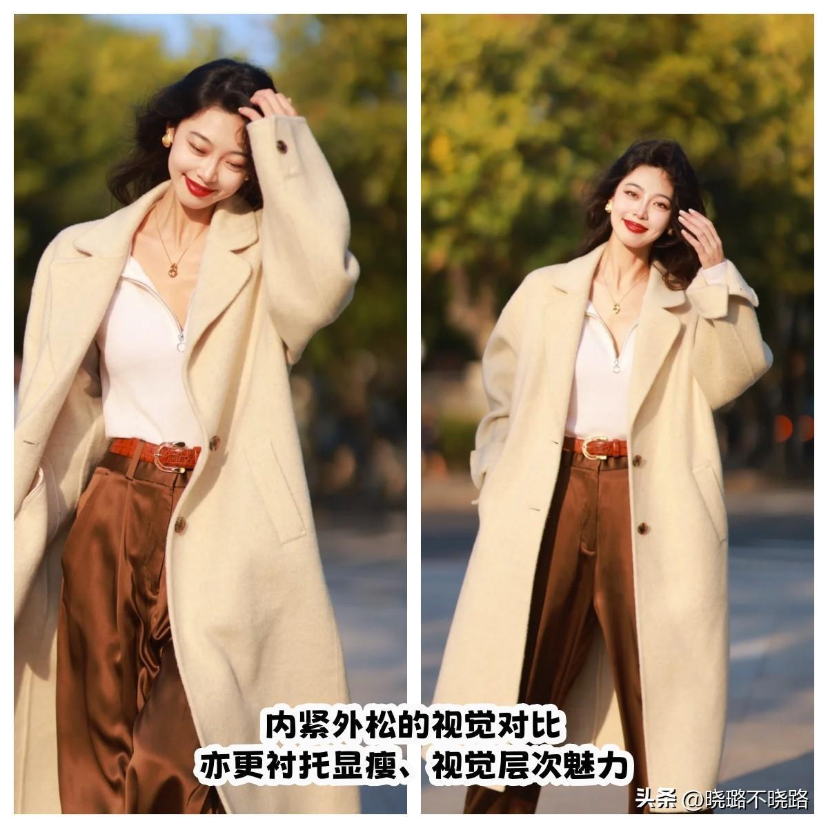 當下正是秋冬的階段,所以建議各位這樣的組合搭配也可以加入長款的外搭進行疊穿,例如像風衣或者是大衣這樣的經典系列不僅可以起到遮肉顯瘦,而且內緊外鬆這樣的穿搭也是非常極具顯瘦感的,只是標準的比例要襯托。