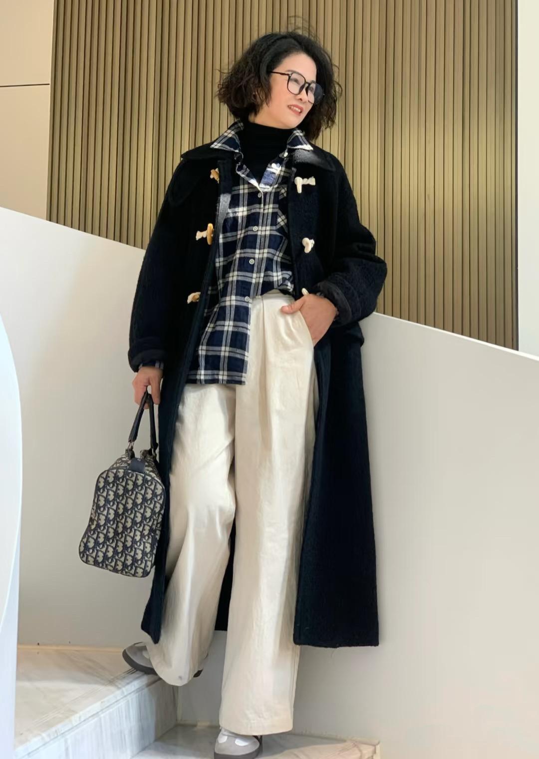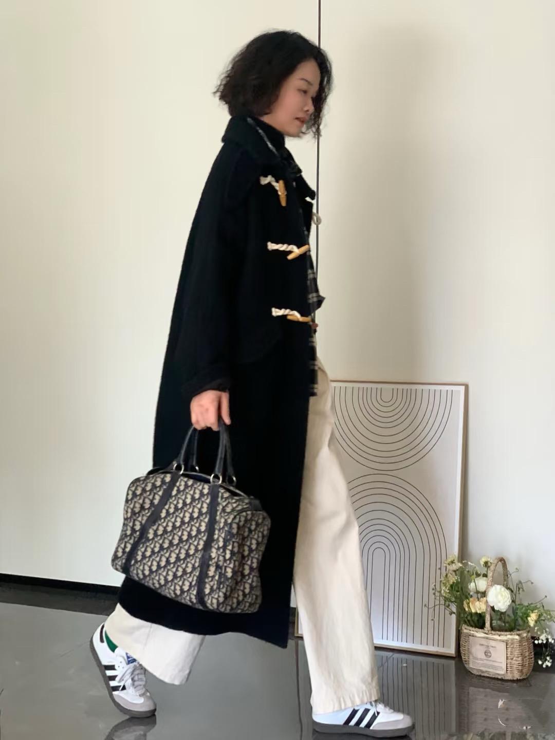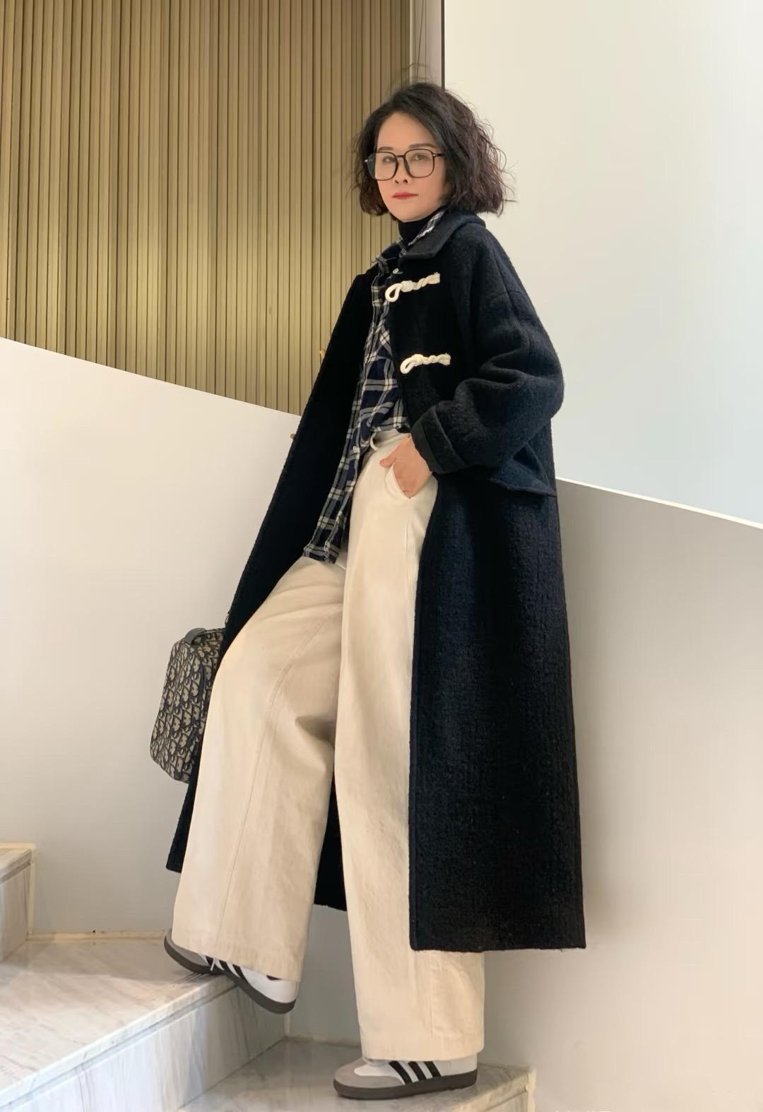 其實這件黑色牛角扣大衣,稍微搭配一下就沒有那麼誇張。學院風的氛圍,50歲的老阿姨也可以hold住。