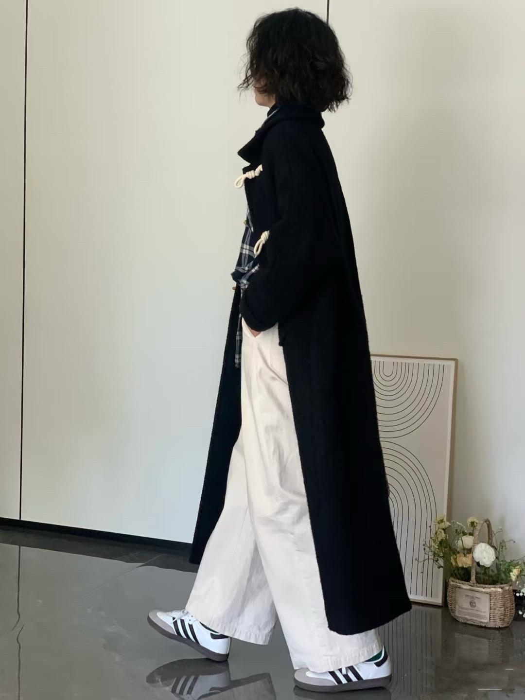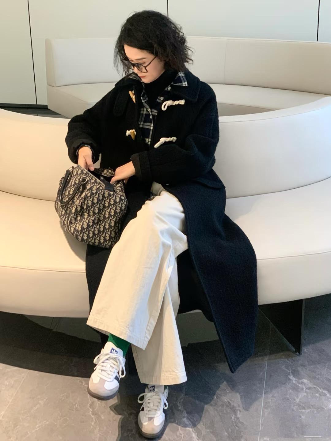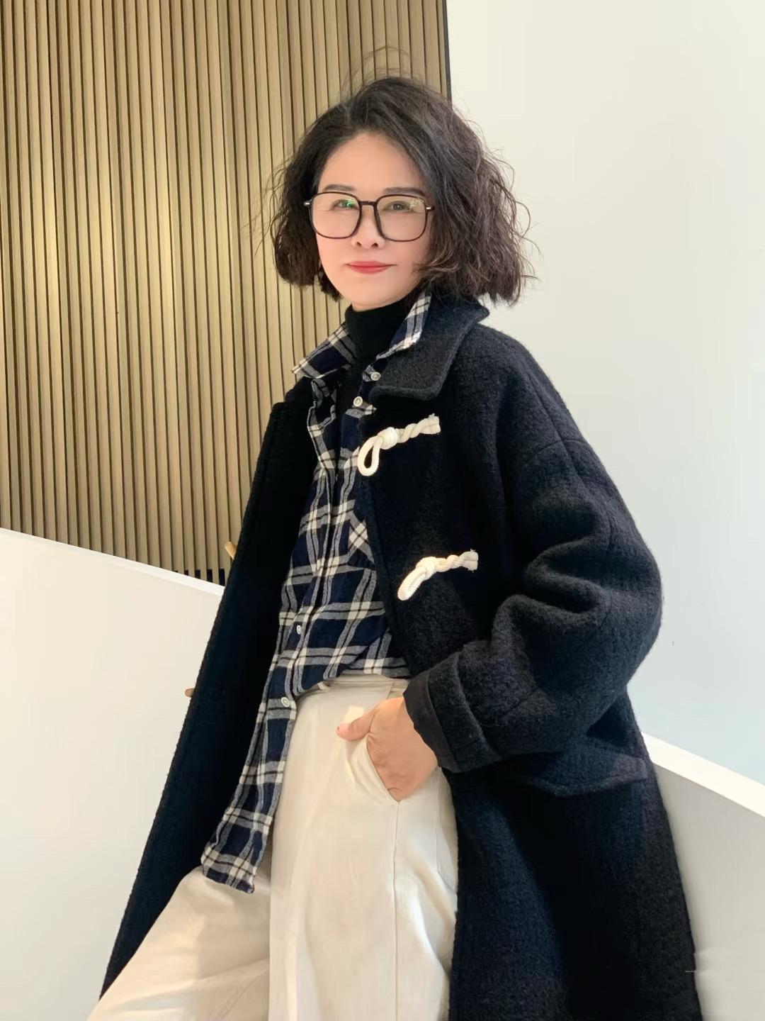 其實這件黑色牛角扣大衣,稍微搭配一下就沒有那麼誇張。學院風的氛圍,50歲的老阿姨也可以hold住。