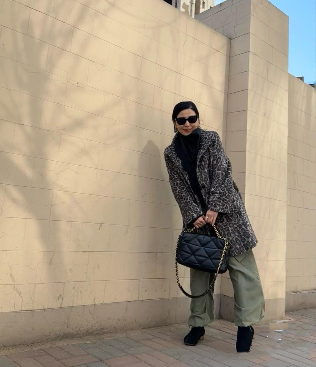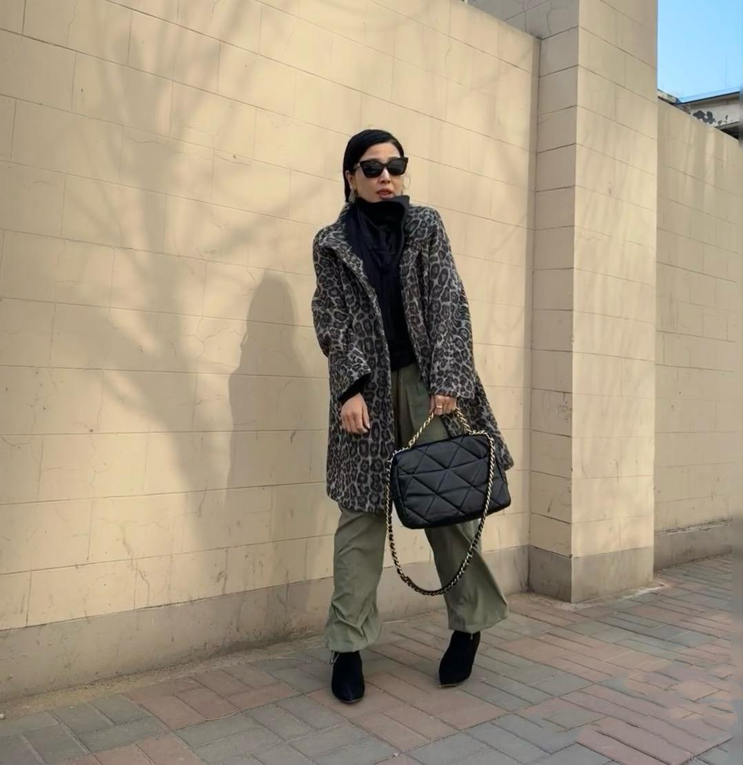 選來選去,最後選定了一條軍綠色的工裝風闊腿褲,帶着幾分酷颯與帥氣,又不是那麼張揚,可以中和豹紋大衣的老氣感,更顯年輕。