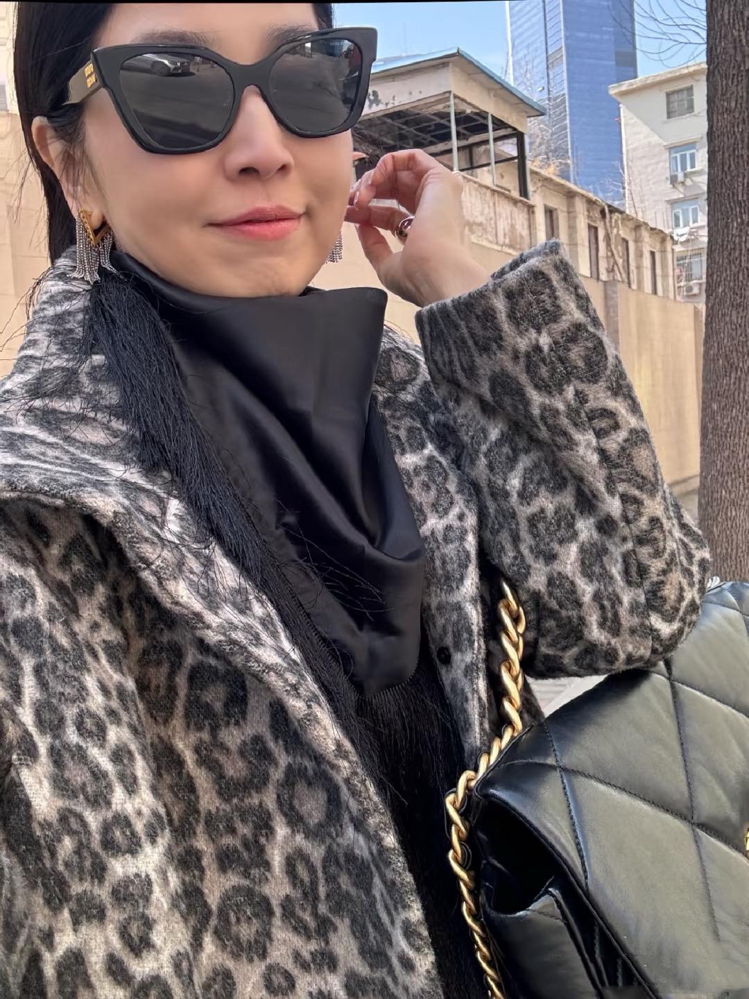 這件豹紋大衣非常厚,又是那種比較硬挺的面料,所以如果穿不好就會顯得老氣。除此之外、這種款式也很容易顯胖。