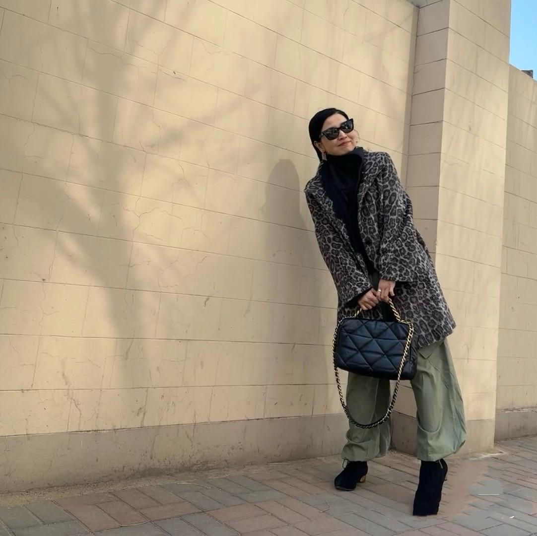 好在我個子不低,感覺還是可以駕馭這件豹紋大衣的。長度到我大腿,並沒有那麼笨重,所以我決定配軍綠色的工裝褲來穿。