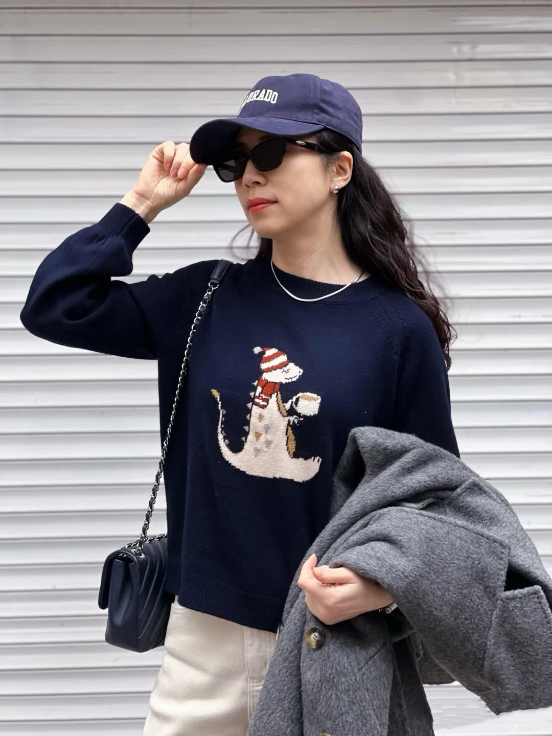 卡通印花的打底衫或者毛衣,就會更洋氣減齡一些。我不太喜歡純色系的打底衫,我覺得不誇張的卡通印花,不單調又更減齡。