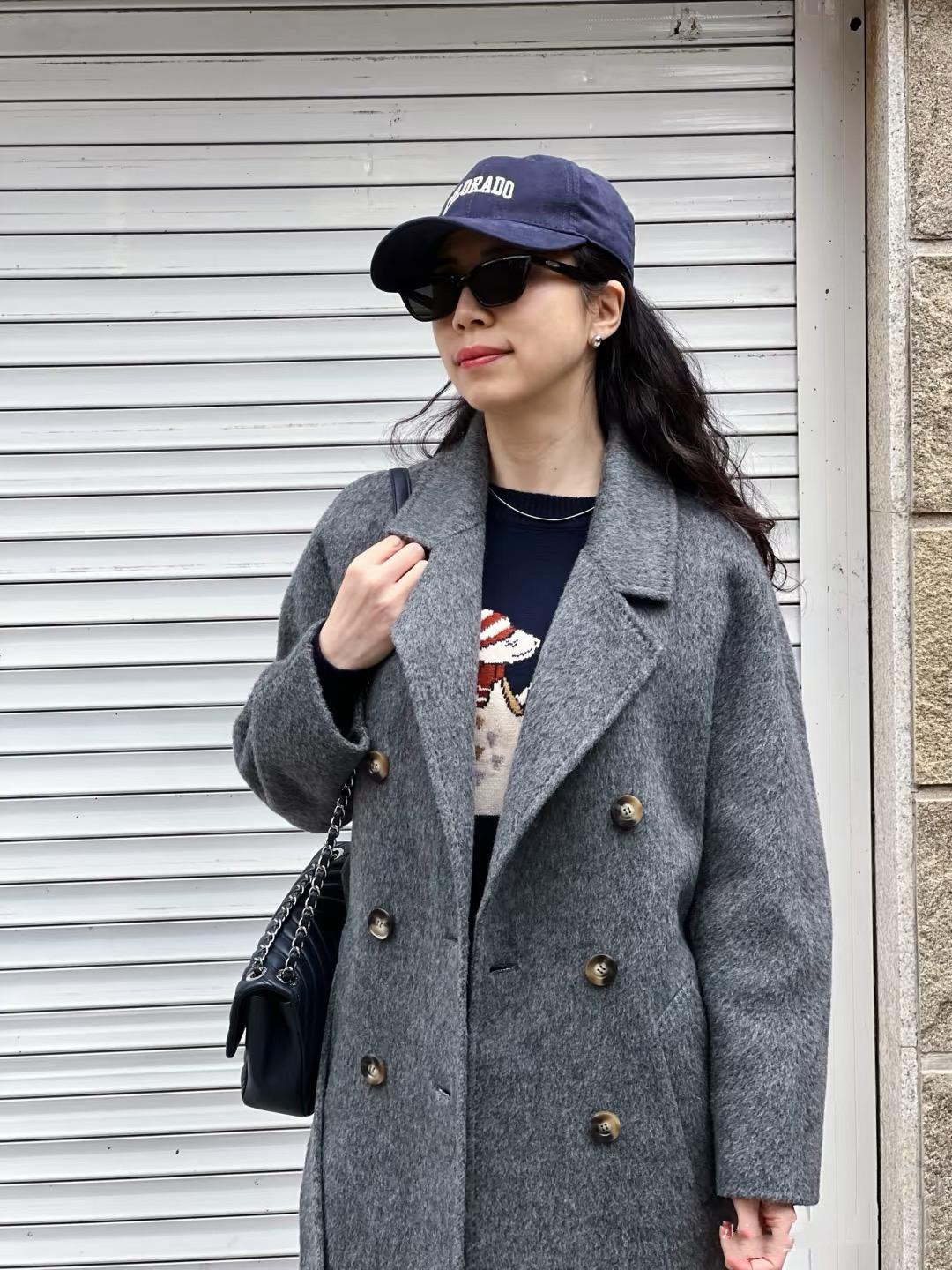 我這件黑灰色的大衣,是一種特別經典的雙排扣,H型的款式、小落肩的設計,倒也不那麼刻板,穿起來自然又大方。