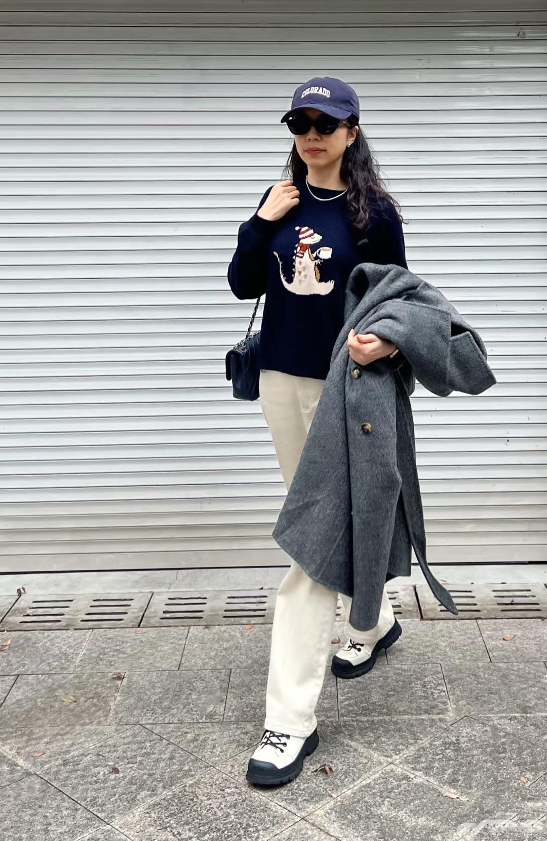 當脫下呢大衣的時候,就會發現卡通打底衫的優勢,整體有了一種少女感,也難怪會被同事誇像40歲。