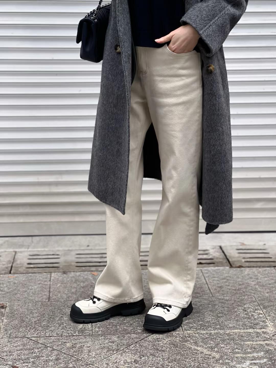冬天裏穿深色大衣的時候,可以儘量去配白色褲子。因爲白色直筒褲更加清爽、高腰的款式也特別顯腿長,整體穿搭時髦又亮眼。