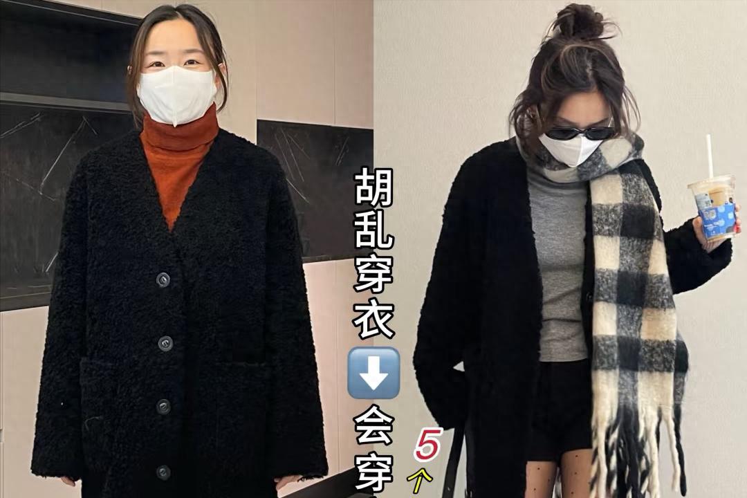 去年的黑色呢大衣,配小腳牛仔褲,不光土氣、還暴露腿型。今年的打扮就格外洋氣了,黑色呢大衣,配上超短褲,透視黑絲襪+V口長靴,洋氣顯腿長,還帶一點小性感,超時髦。