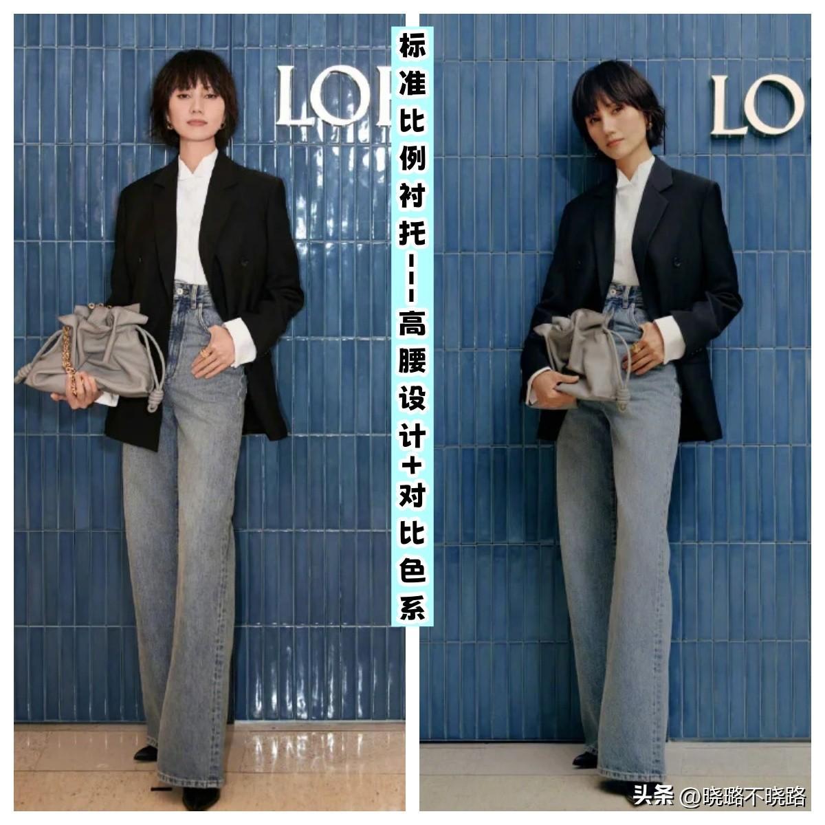 當然拉比較標準的比例線也建議各位還是需要將其強調出來的。在進行搭配的時候所選擇的單品一定是自帶高腰的設計,又或者是我們自己去營造上短下長的標準比例。這個時候其實利用對比色系在視覺上進行分割也是很好的法則搭配。