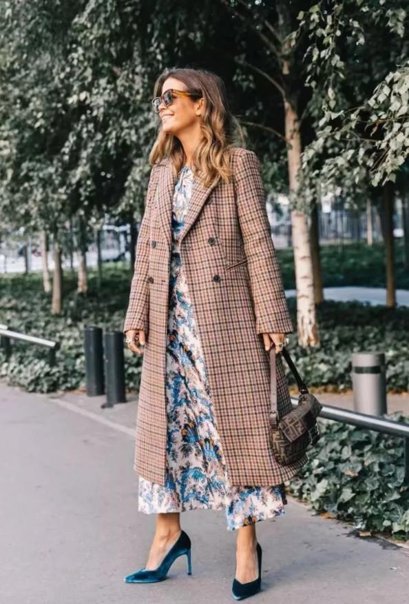 格子款式的雙面大衣,有種簡單的復古感,看起來也比較低調的款式,可大衣的質感卻很棒,在秋冬季節穿起來就更加有範了,內搭一件花色連衣裙,能很好襯托出人的獨特氣質,搭配一雙藍色高跟鞋,就帶着一種不言而喻的美。