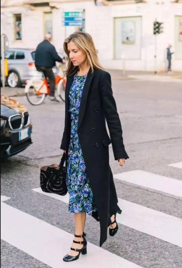 經典的雙面黑色大衣,看起來真的十分顯氣質和高級,內搭一件藍色碎花連衣裙,很好營造出浪漫的氣息。整個着裝打扮能讓穿搭達到一個減齡的效果,也能穿出氣質和隨性,搭配一雙黑色高跟鞋,這樣看起來就更顯氣質了,無需刻意去打扮也能讓你看起來精緻感滿滿。