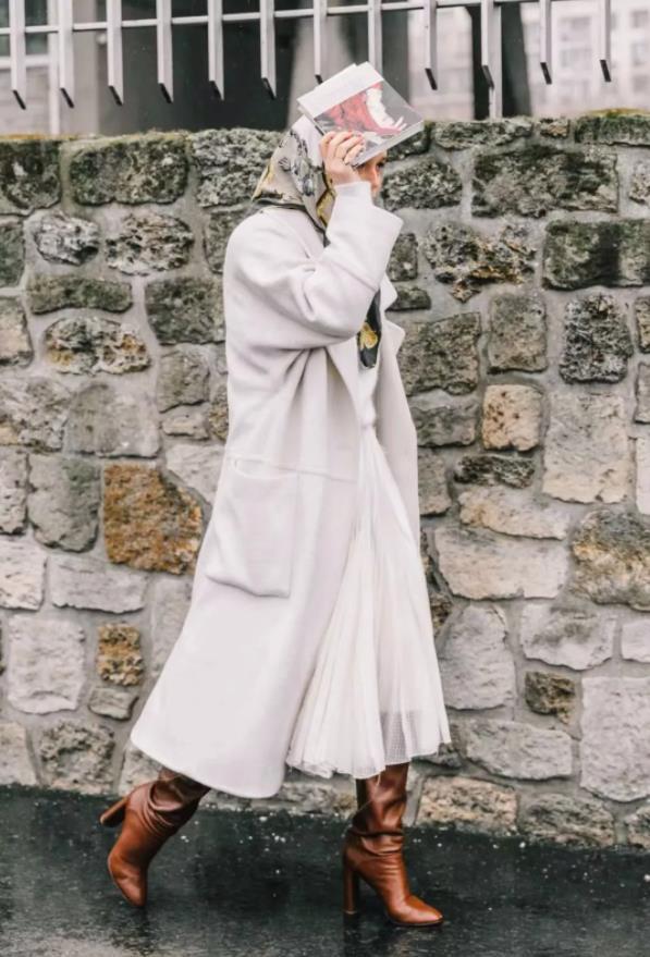 這種奶白色系的大衣,看起來就非常溫柔呢,寬鬆的版型,對身材是一點包容性都沒有,內搭一件白色羊毛打底衫,能輕鬆應對各種場合,還很保暖,選擇一條白色網紗半身長裙,這種穿搭瞧着就非常不錯,鞋子選擇了一雙咖色長筒靴,這樣穿很保暖,也能塑造出一種大女人範的既視感。