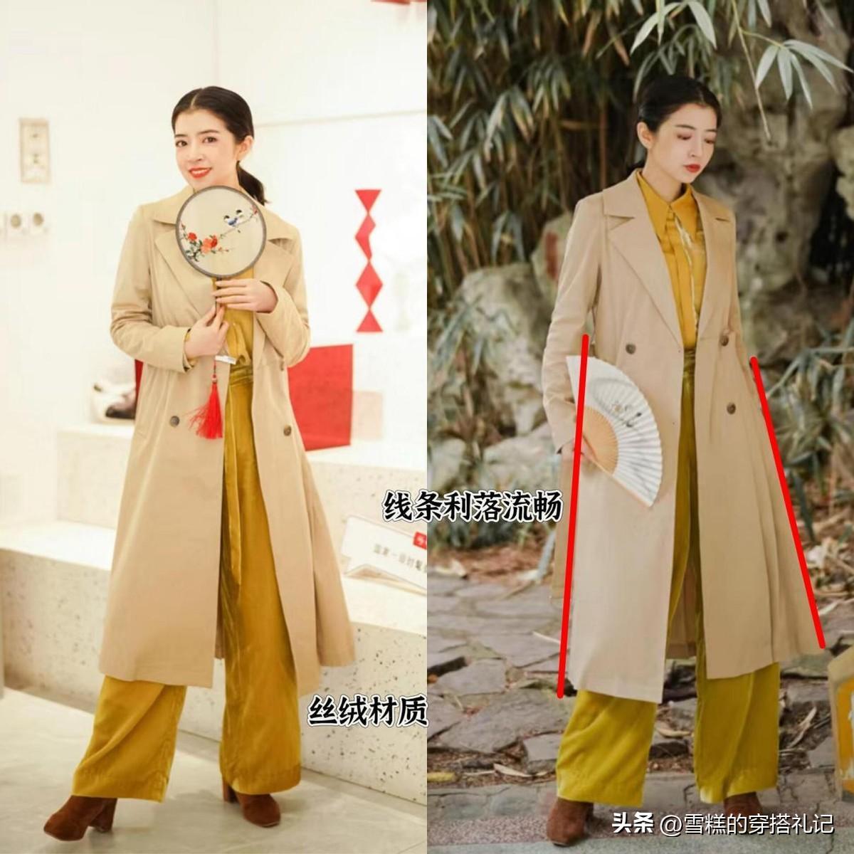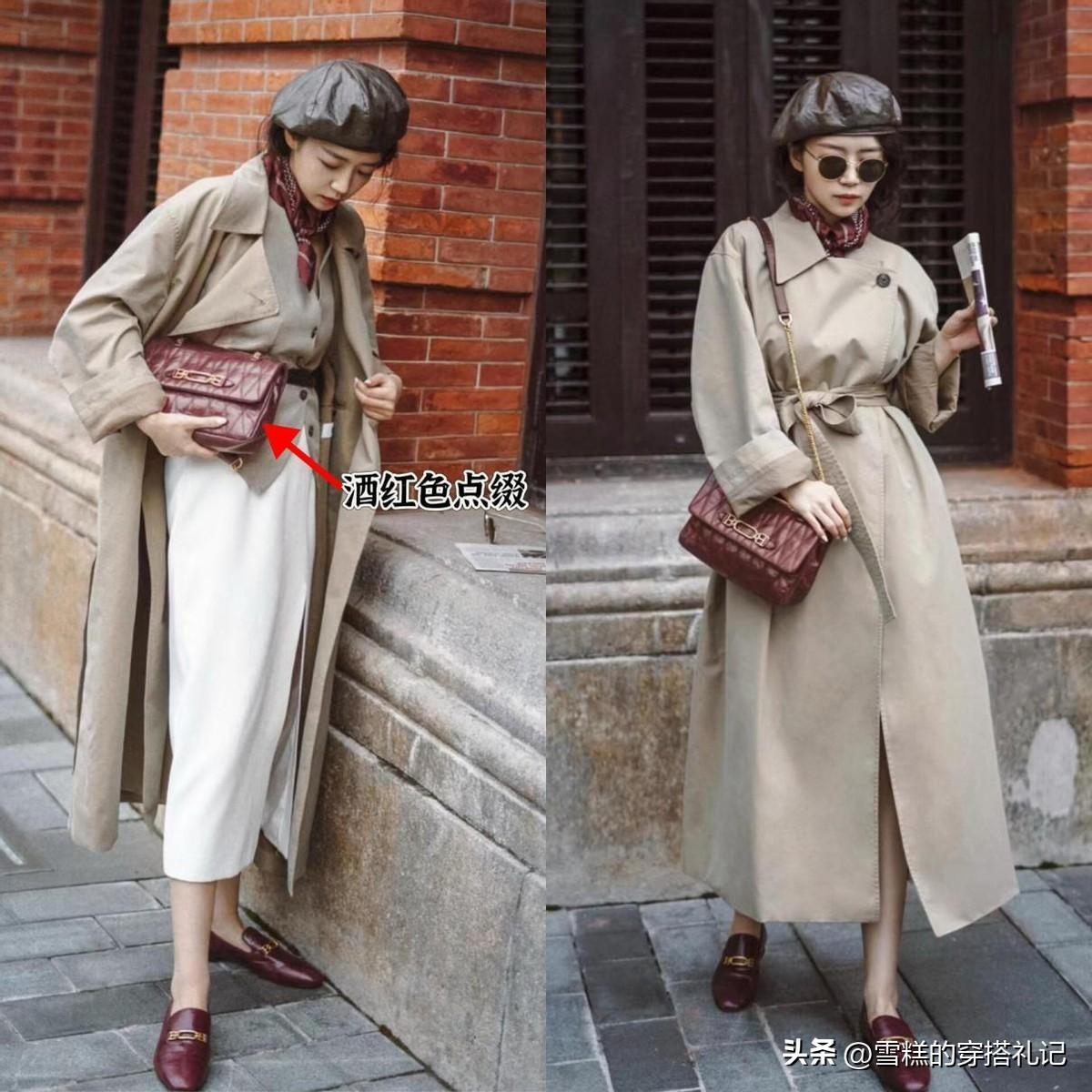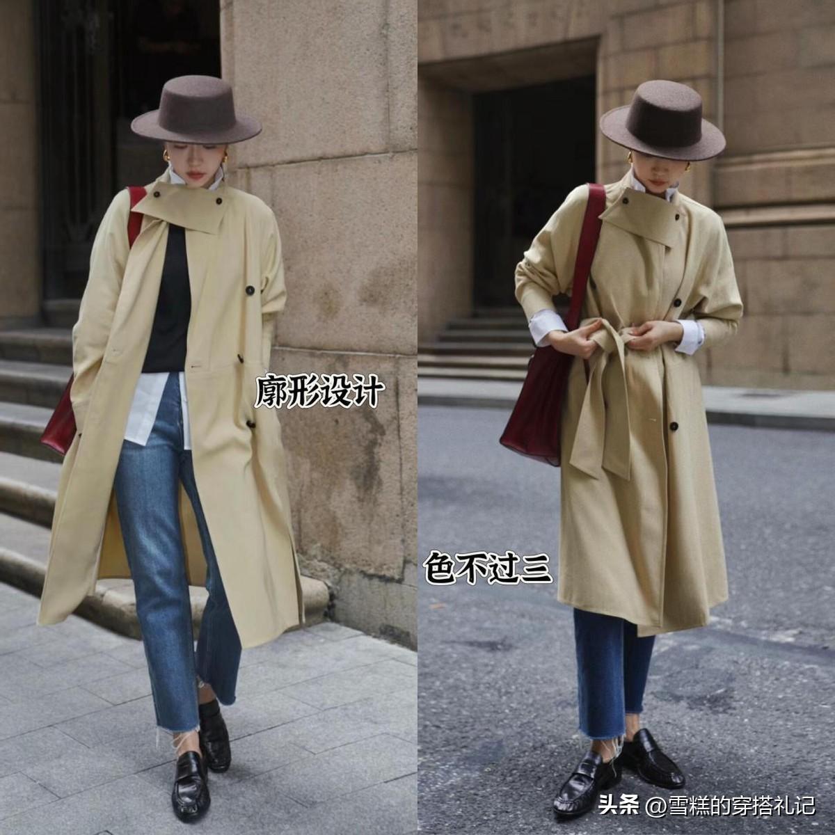 穿衣打扮最忌諱的就是沒有亮點,如果每一件單品都顯得很普通,想要搭出高級感,難度係數就會增加。尤其是穿卡其色系帶風衣的時候,建議可以將風衣敞開穿,在內搭上花點心思既可。