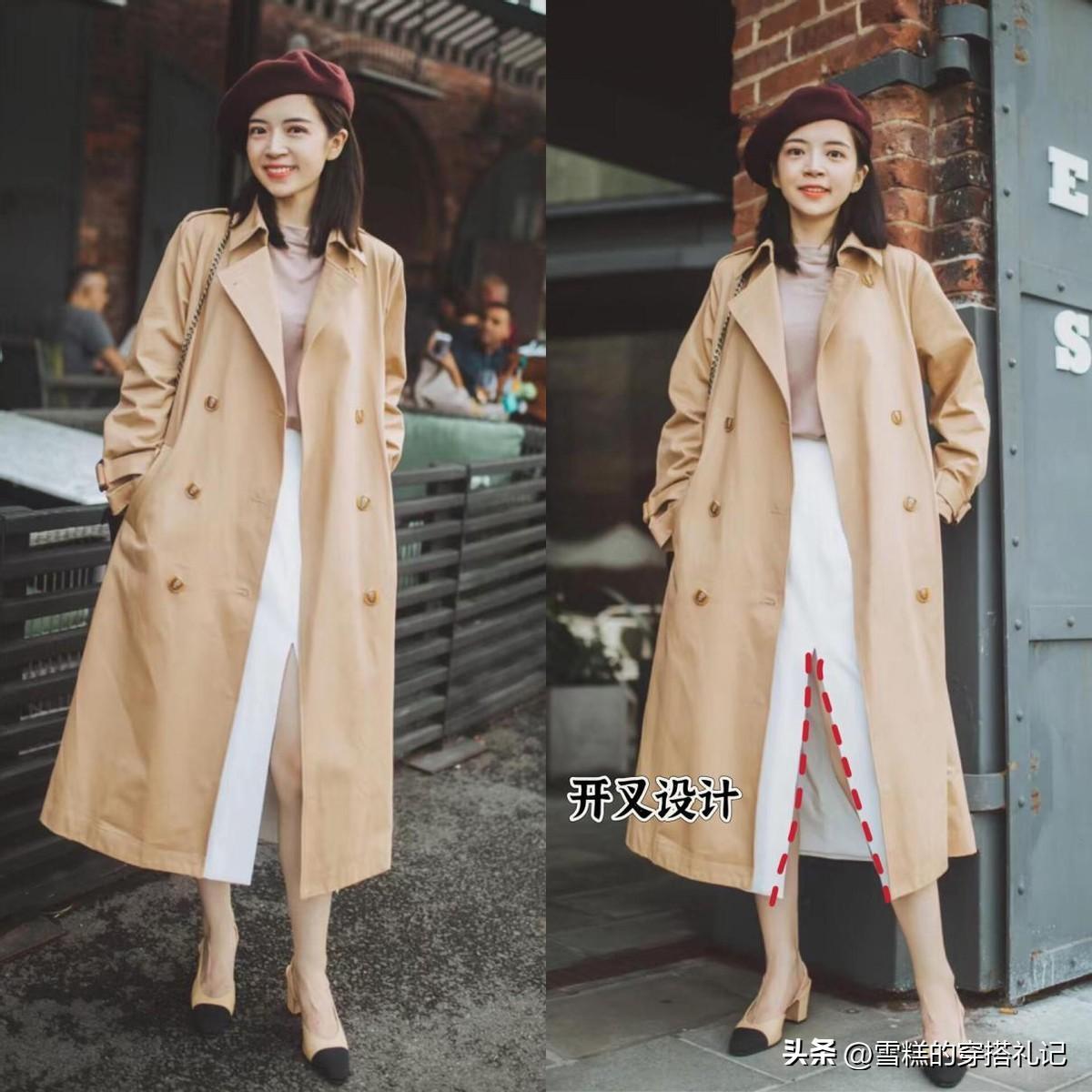 風衣的搭配模式是很豐富,一件風衣,就可以解鎖“百變造型”。像這種經典款的卡其色直筒風衣,穿法就很多樣化,長度剛好超過膝蓋的風衣,疊穿長度一致的白色開叉半裙,增強下身露膚面積更輕盈。