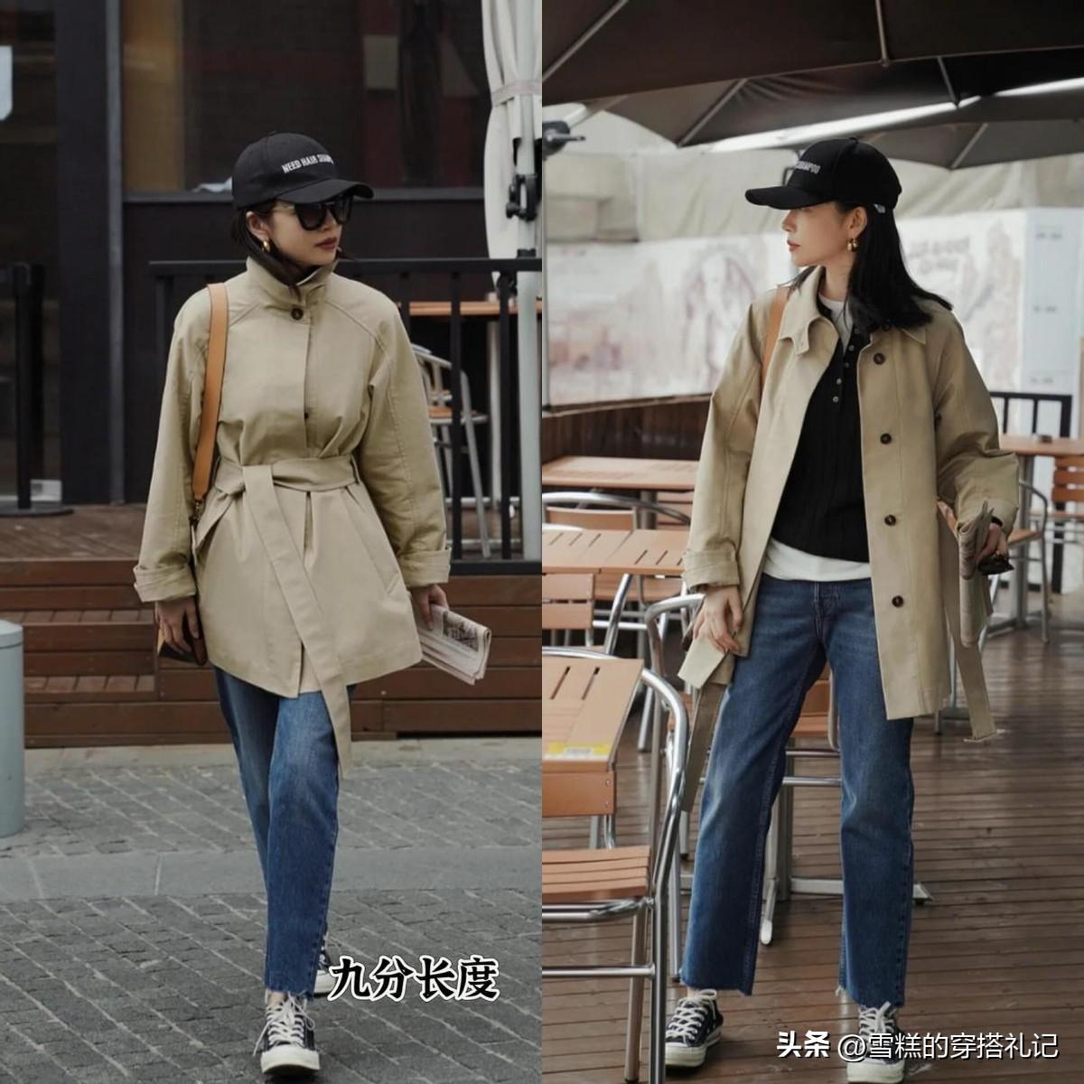 剛好遮住臀部的風衣,既可以敞開穿,也可以繫上腰帶穿,前者會顯得造型更加豐富,後者能分割比例,再搭配上就分煙管褲和帆布鞋,減齡感十足。