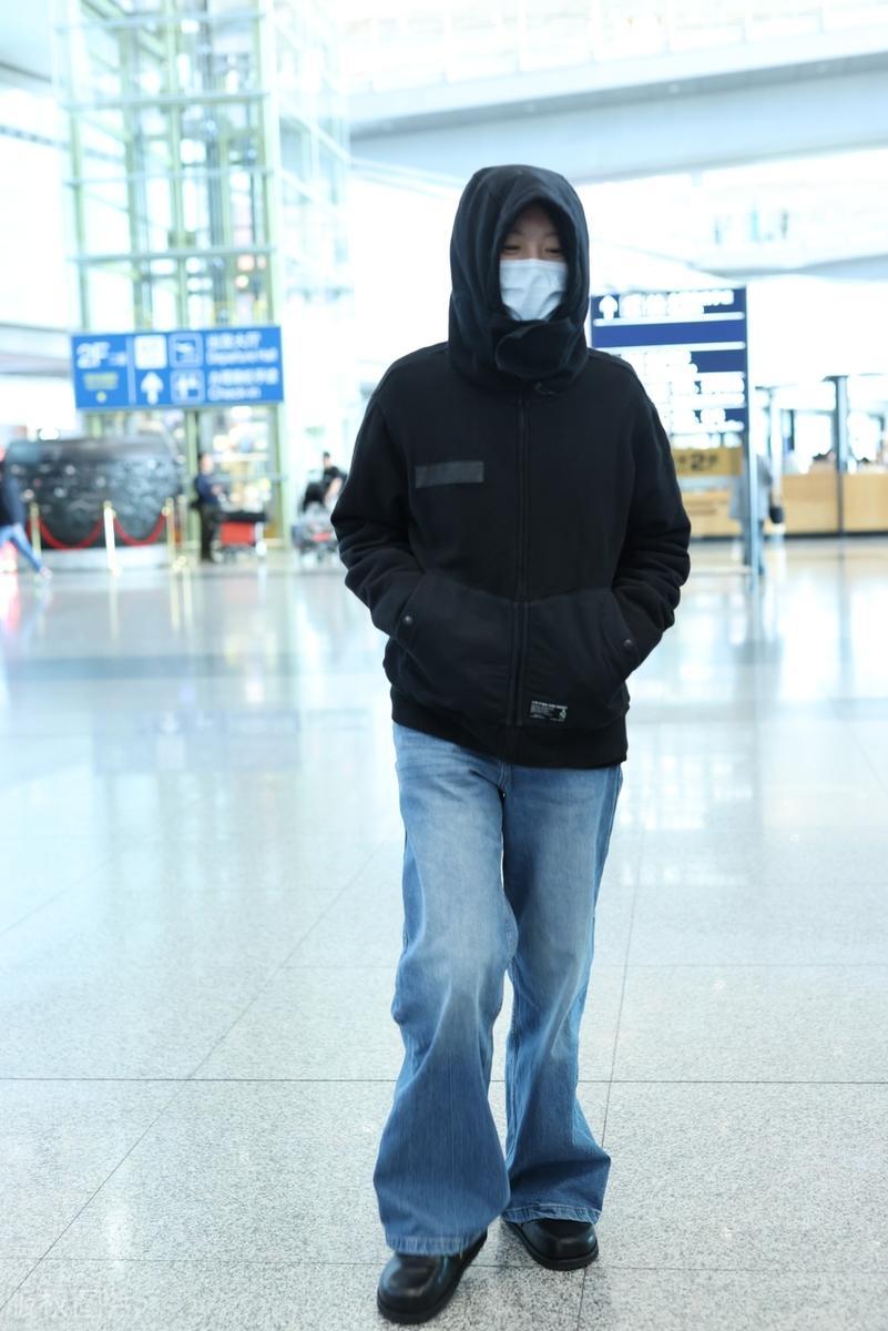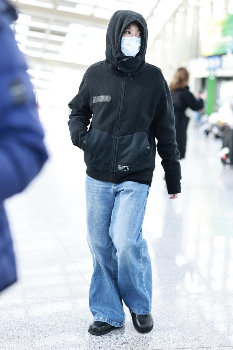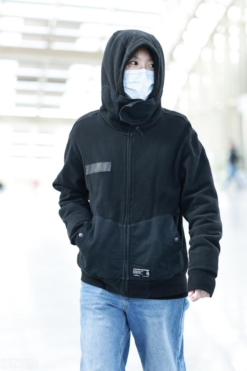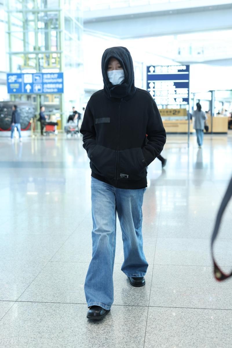 竇靖童走機場,真的是非常低調。這穿搭可以說是相當中規中矩了,她穿了一件黑色連帽的衛衣、配了一條藍色的直筒牛仔褲,還戴上了口罩。