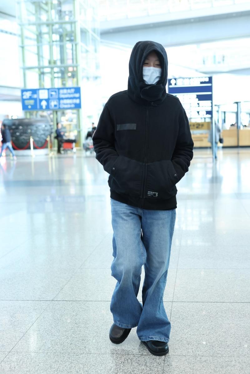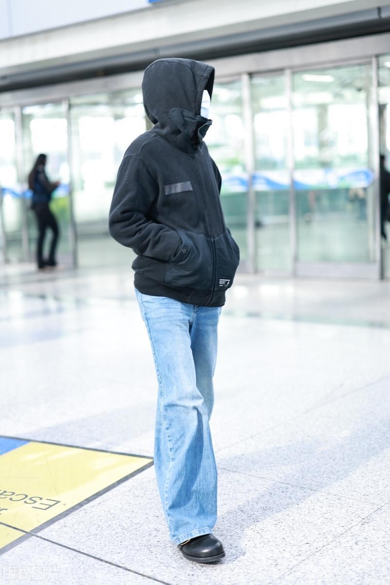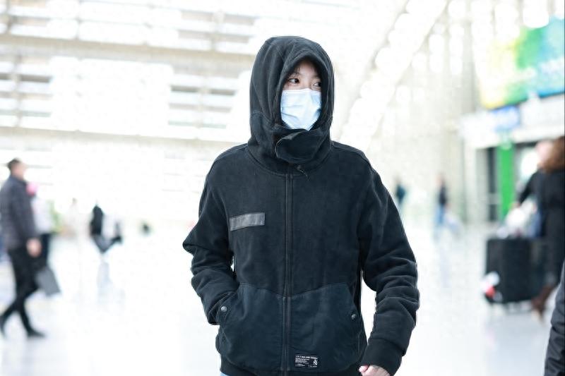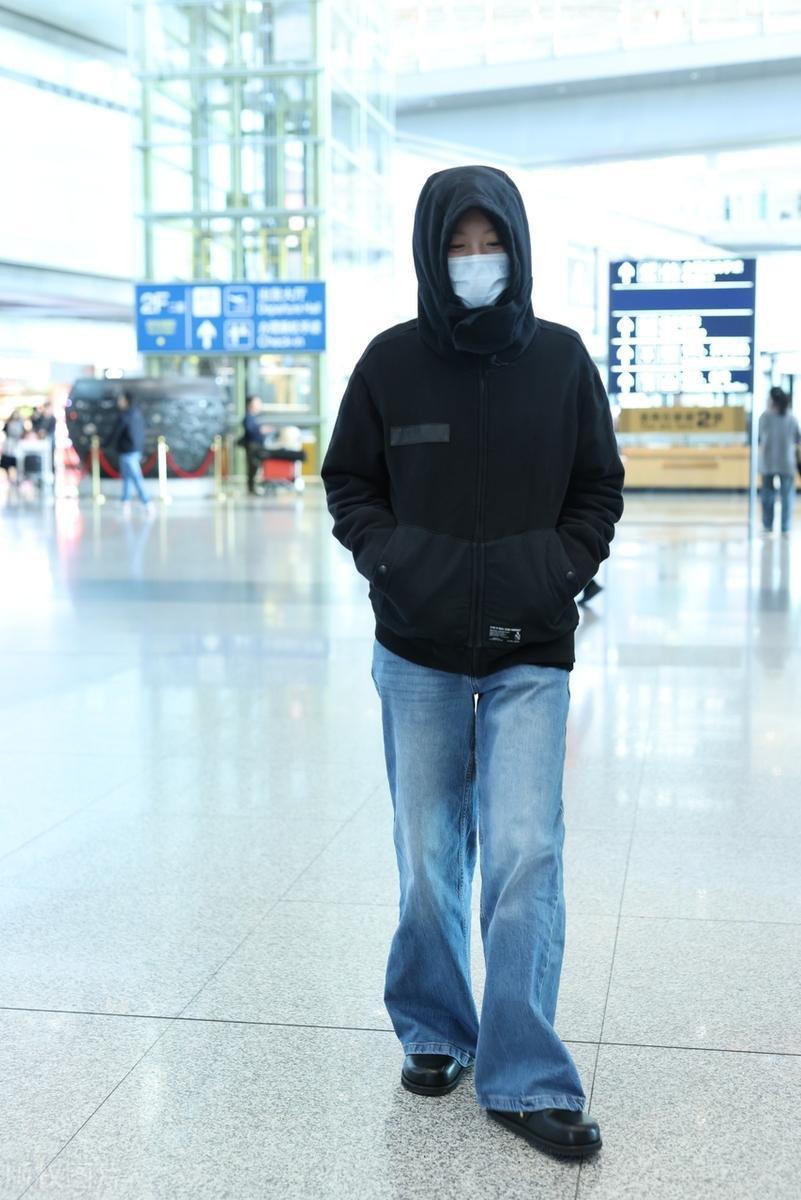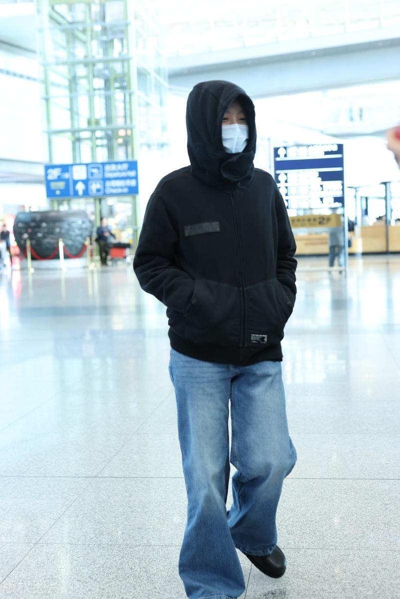 竇靖童走機場,真的是非常低調。這穿搭可以說是相當中規中矩了,她穿了一件黑色連帽的衛衣、配了一條藍色的直筒牛仔褲,還戴上了口罩。