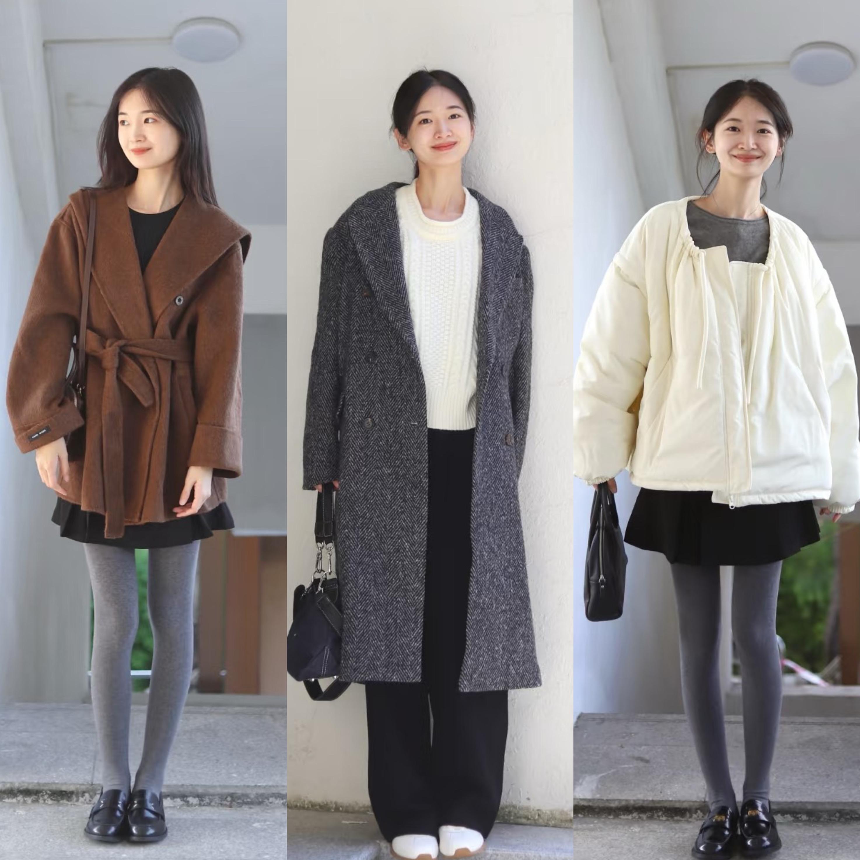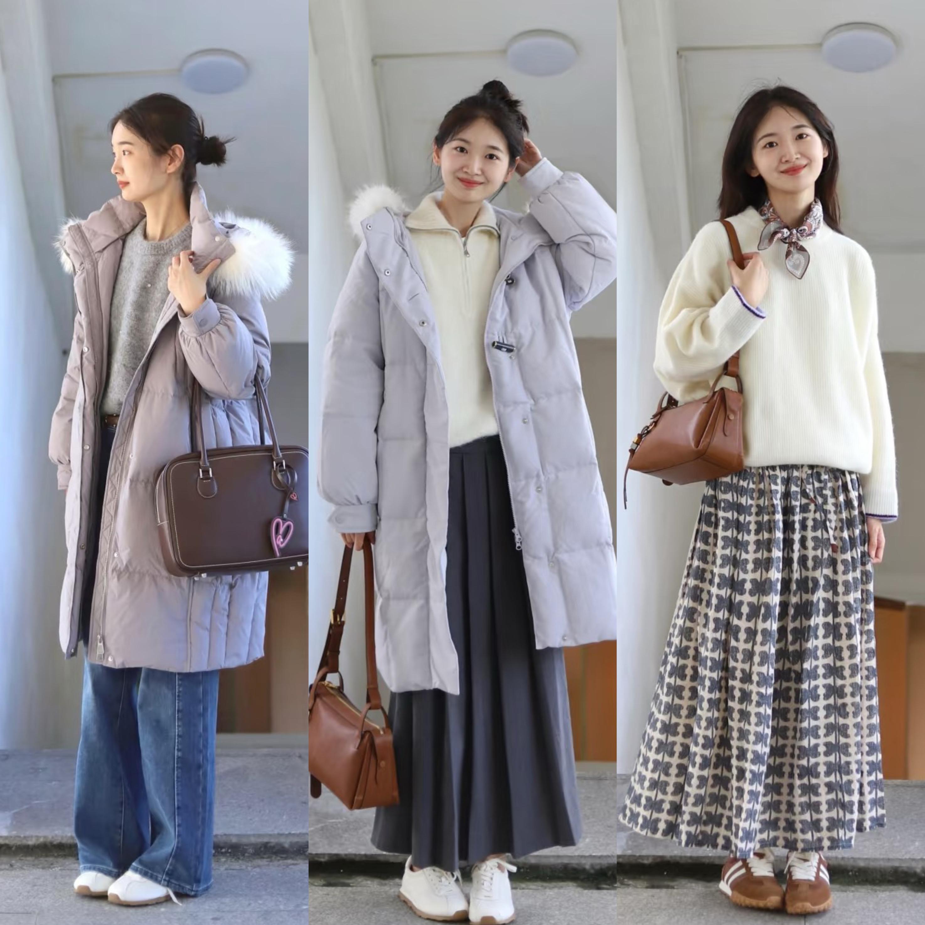 這個冬天,就穿得溫柔乾淨一點吧。白色羽絨服、可以配圓領的打底衫,高腰的A字形半身裙,很溫柔也很減齡。打底衫+灰色打底褲,顯瘦又不土氣。