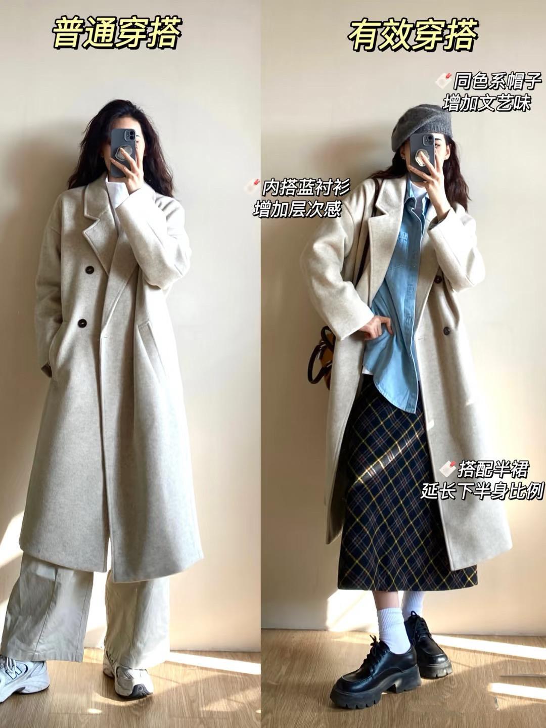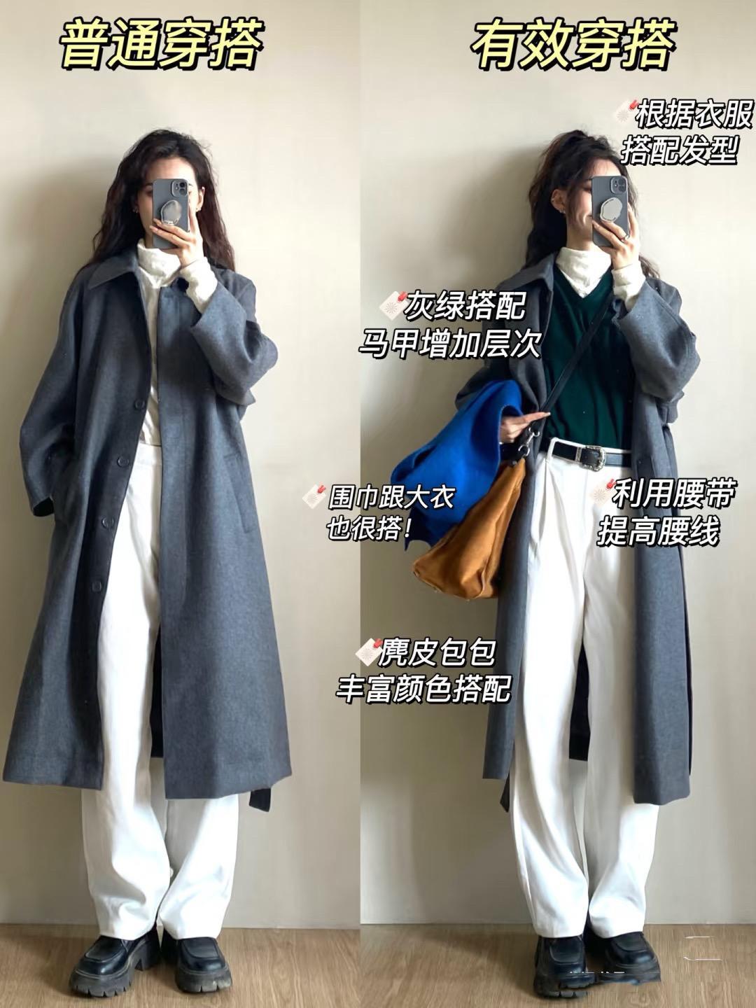 像這種灰色大衣,我們可以配半高領打底衫、高腰的直筒牛仔褲,疊搭深色馬甲。出門的時候,還可以配上圍巾,更加保暖也更有層次感。