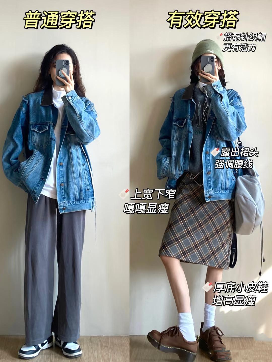 牛仔外套配基礎款打底衫、直筒褲,這種長款牛仔外套會形成風格感,但是比例並不優越。用牛仔外套配格子裙、厚底鞋、中筒襪,就有了學院風的氣質、也很減齡顯瘦。