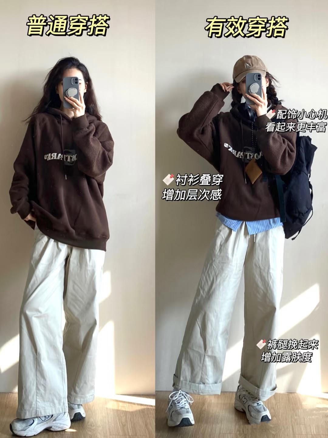 一件棕色的美拉德風衛衣,直接配闊腿褲中規中矩,屬於一種低調卻不夠時尚的穿搭。