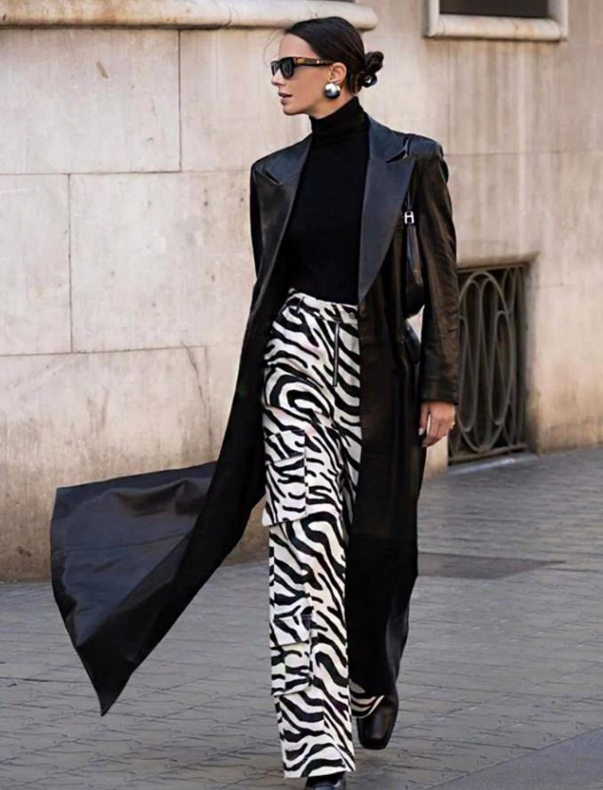 只有嘗試過這種黑色皮質長大衣,才能懂它有多帥吧?長款的皮質大衣,內搭一件黑色高領毛衣,黑色皮大衣和內搭進行了呼應,同色的組合,看起來就十分顯瘦。很不失氣場的穿搭,還能毫不費力穿出大女人風,搭配一條斑馬紋工裝闊腿褲,就能展現出自己的個性,腳下一雙黑色平底鞋,優雅且不過時。
