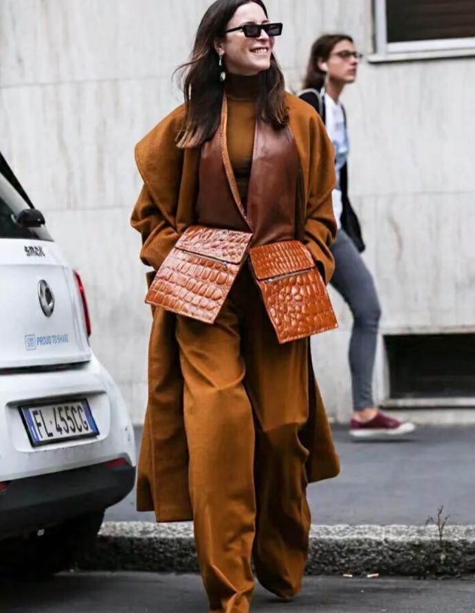 這種焦糖色的雙面大衣,真的太有氛圍感了,很適合秋冬的一個顏色,內搭選擇了同色的打底,以及疊穿了咖色馬甲,豐富了整個着裝造型。下身配的闊腿褲,顏色也與大衣一致,和諧高級又非常有範,很不失質感的一套。