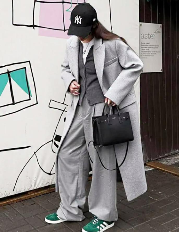 沒有人會覺得這種灰色雙面大衣的吧?內搭一件灰色馬甲,就能很好塑造出一種品味和高雅,搭配上一條灰色闊腿褲,就有種剛柔並濟感,腳上穿着一雙綠色運動平底鞋,這樣看起來就更加吸睛了,很休閒個性又保暖。