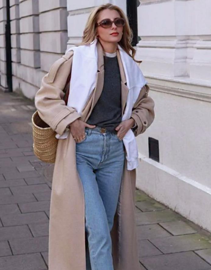 灰色中長款大衣,可太不失高級和耐看了,這種灰色調也很百搭,內搭一件白色打底+襯衫,層次感的疊穿,可時髦了。整個着裝看起來有些顯鬆弛,搭配一件白色t恤,也能在溫暖間找到平衡,搭配一條藍色牛仔闊腿褲,瞧着很灑脫,也無懼寒風的侵襲,同時還不失女人味。