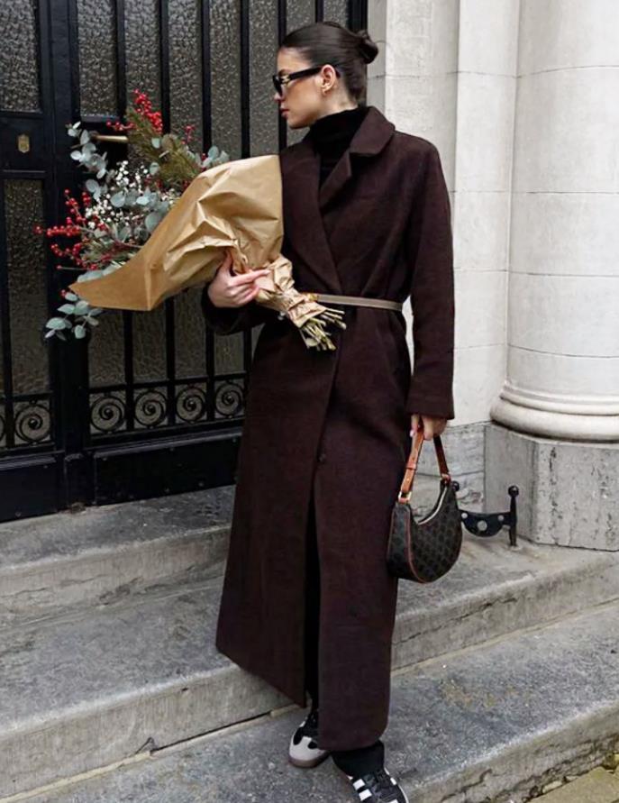深咖色的雙面大衣,這個色調就是十分適合秋冬季節的,內搭一件黑色針織打底衫,這兩種配色組合在一起,可太高級了,在視覺上也十分顯瘦。有種恰到好處的精緻,選擇一條黑色闊腿褲,整體看起來就很不失慵懶放鬆,搭配一雙運動鞋,也太不失休閒和隨性了。