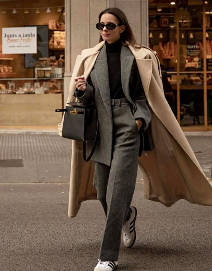 外套+外套的疊穿,真的是最適合寒冷冬天的了,卡其色的雙面大衣,內搭一件灰色西裝外套,大衣就那樣隨便披在肩上,可有範了,內搭一件黑色高領打底衫,很好展現出高級與時髦,選擇一條灰色闊腿褲,無處不在訴說着高級感,腳下踩着一雙白色運動鞋,整體看起來又多了幾分休閒和大方。