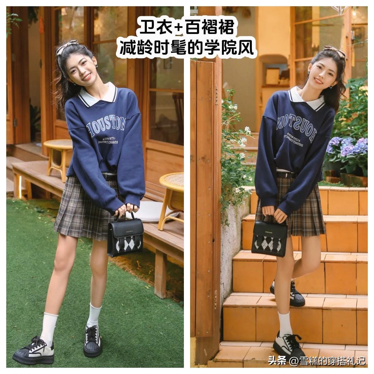 任何一款衛衣在搭配百褶裙或者是a字裙的時候,尤其露出來我們腿部的狀態,那麼整體的減齡感以及時尚感就非常明顯了,真的很適合大家在出行遊玩或者是居家的時候來這樣進行搭配,不僅可以遮擋身上的不足而且這樣的穿法非常凸顯少女感。