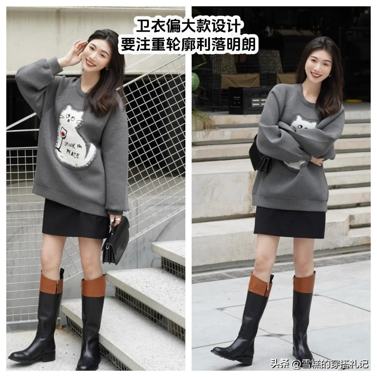 衛衣的搭配最終展現下身失蹤的穿搭,下身單品就可以將超短款的裙子或短褲來優選搭配啦,且在秋冬季節完全可以將長筒靴結合起來,若都是同色系列的搭配那麼在視覺上的縱向拉伸感是很強烈的哦,且長款的靴子記得優選搭配修直的款型,十分顯瘦。