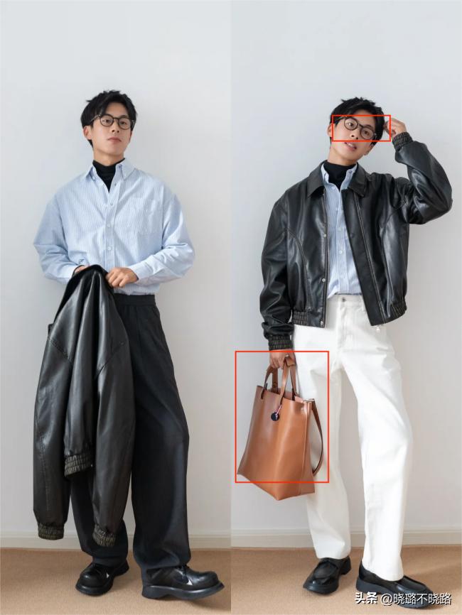 通過這第三組對比圖,想必已經能感受出來塞褲腰的好和不好,褲子腰沒塞好其實對身材改善不大,也不能提升整體氣質。把衣服塞進褲子裏反而顯得有點老氣,不夠時尚,還可能少了一些男性的硬朗感覺。相反,如果讓襯衫自然地垂下來,整個造型就會顯得年輕很多,有一種不經意間的帥氣感,讓你的搭配更加搶眼。