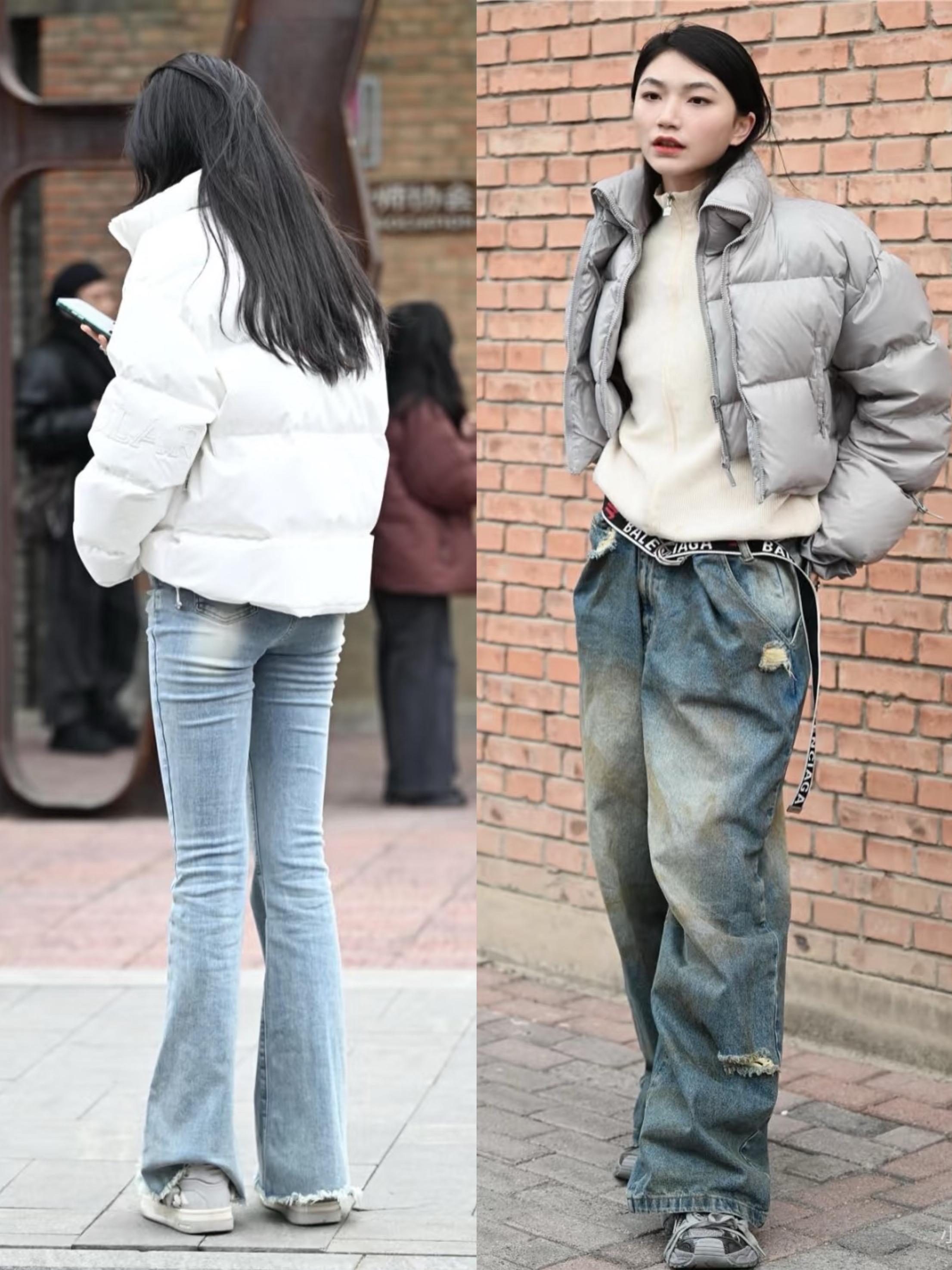 短款羽絨服,配上高腰的長褲。或是寬鬆的版型、或是修身的剪裁,都可以帶來更體面時尚的氛圍。這種寬鬆的牛仔闊腿褲,配上短款羽絨服,時尚不羈更是耐看。