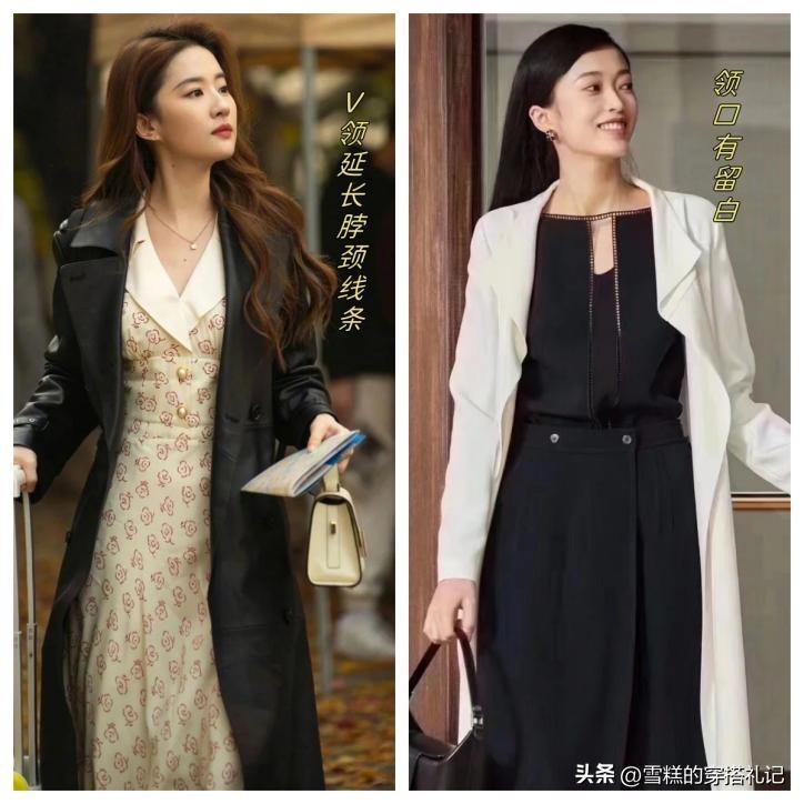 雖然天氣逐漸轉涼,但是我們的風衣穿搭也要避免沉悶感,可以多多嘗試運用“留白”的技巧。例如在上身領口的選擇當中,選擇 V 領、U 領或帶有獨特留白設計的領口,這樣可以延長和拉伸我們的脖頸線條,顯得造型更加輕盈。