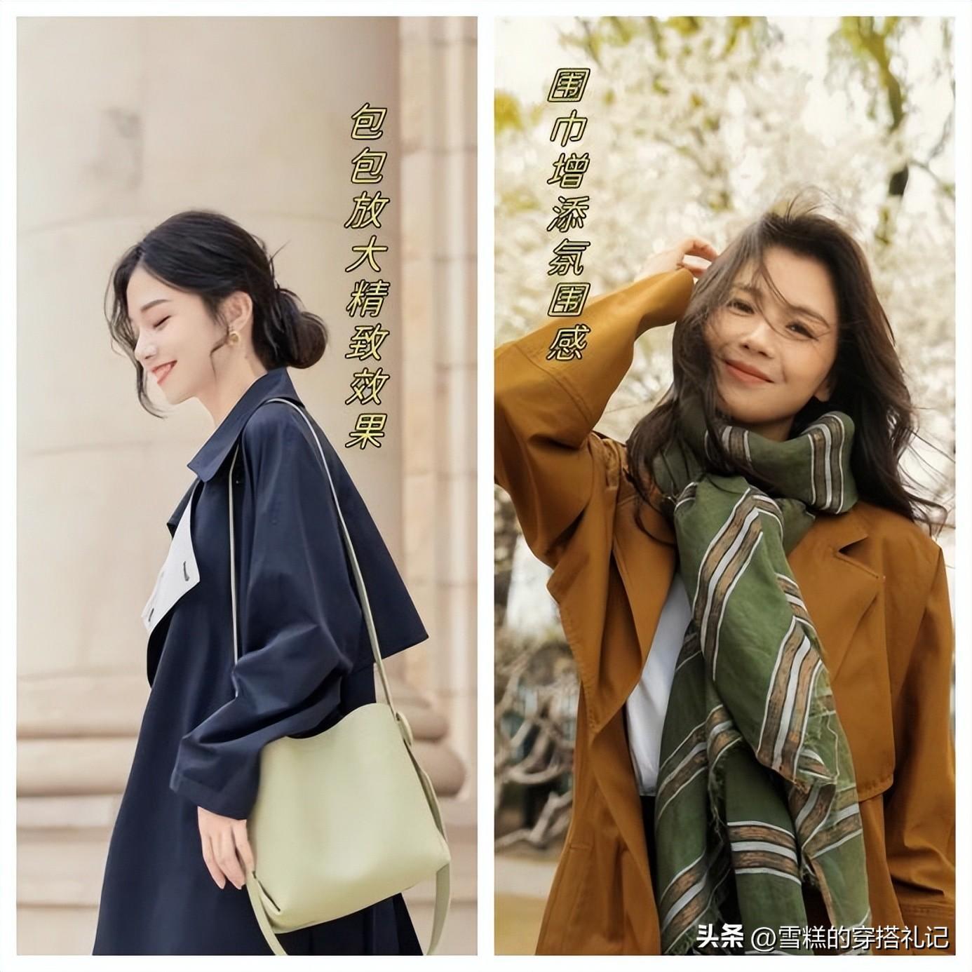 風衣穿搭除了服飾本身的搭配之外,配飾在造型中也可以起到點睛之筆的作用。例如選擇具有氛圍感的絲巾,烘托出女性優雅氣質的一面。或者搭配精緻的包包,完美地營造出優雅的氣息。