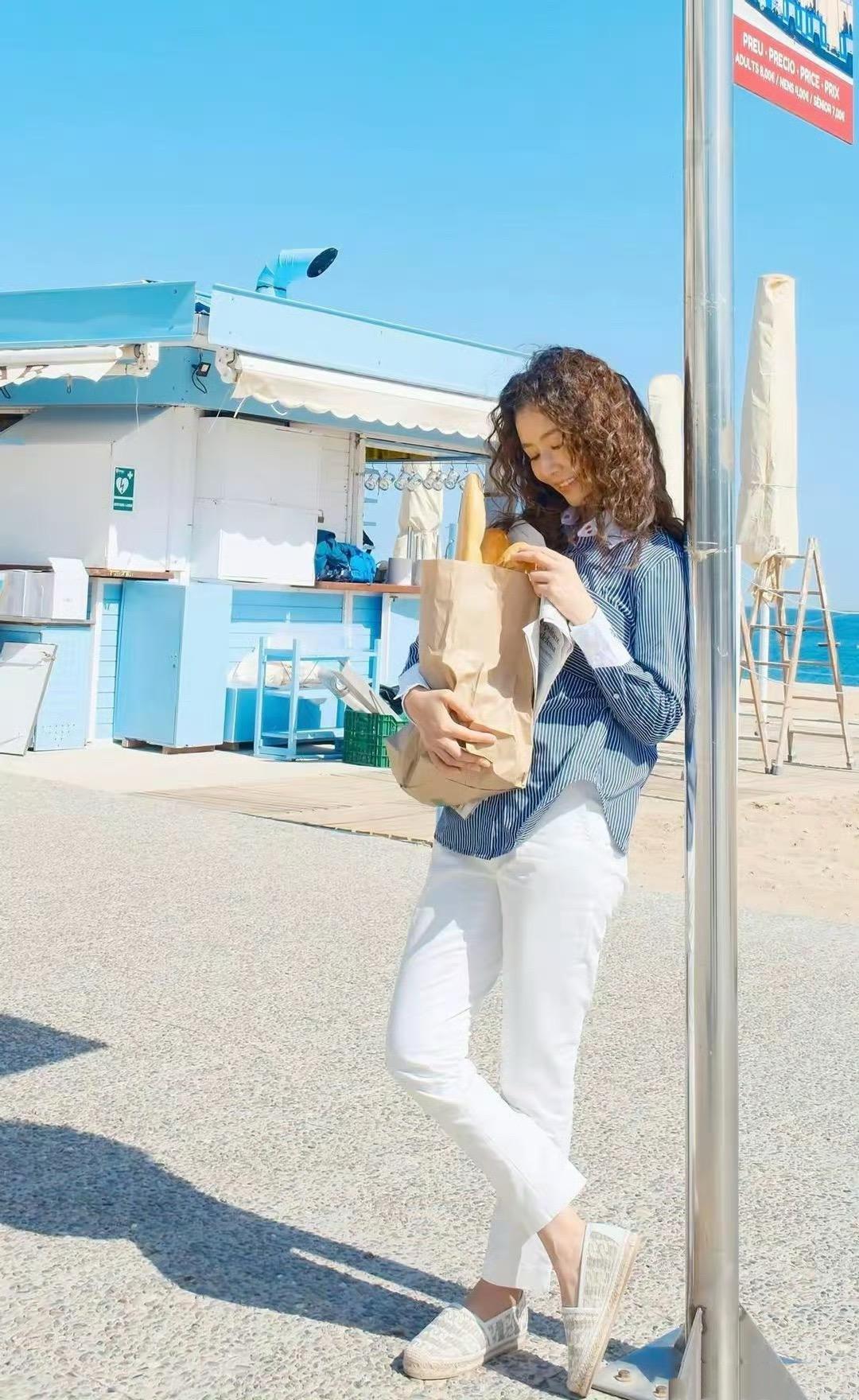 她平時比較低調、整個人特別多溫柔,穿衣搭配也是走文藝風、或者學院風、甜美少女風這樣的路線。就像條紋毛衣+白襯衫的搭配,就非常的洋氣減齡。