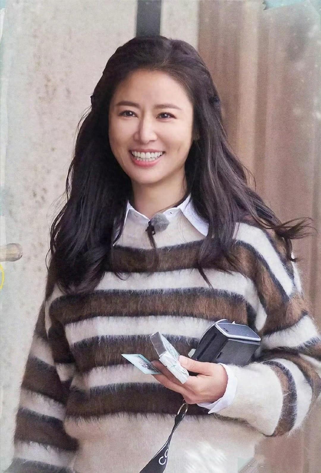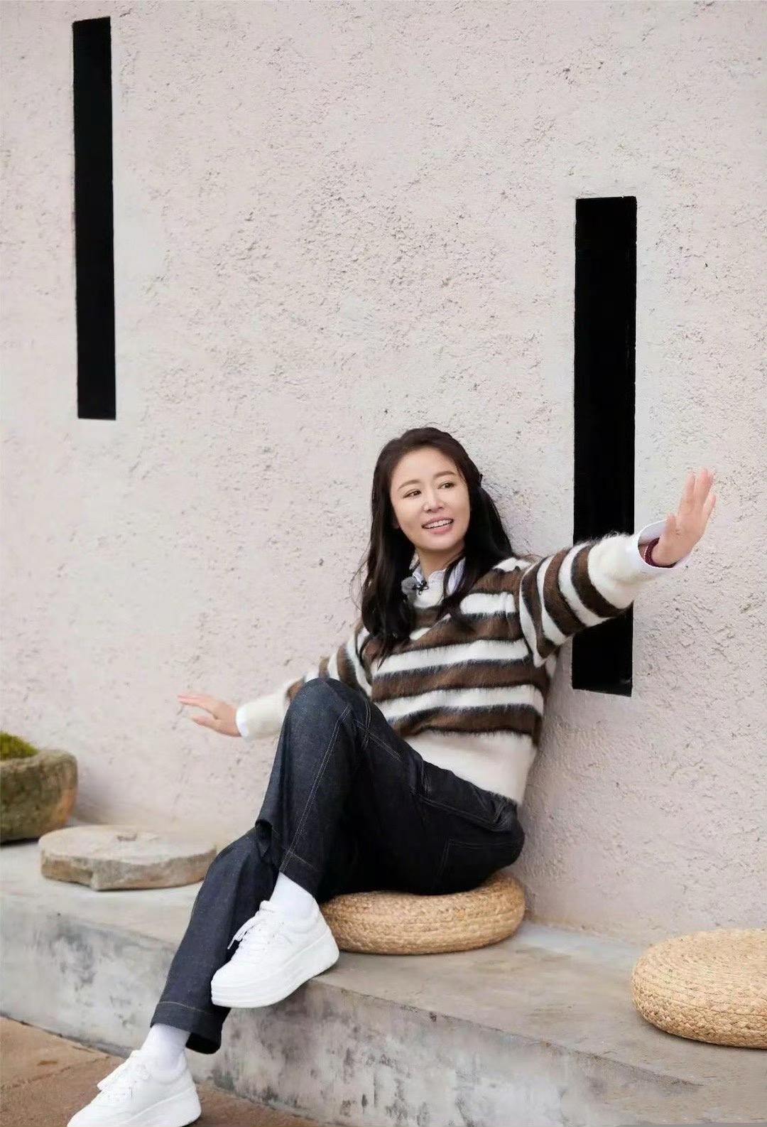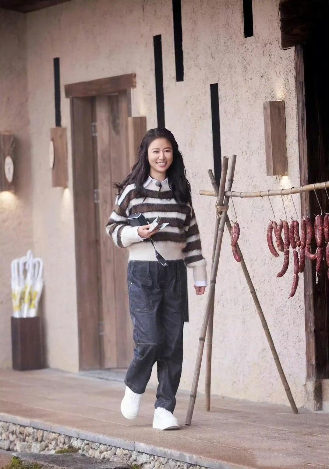 47歲林心如真會穿,條紋毛衣+白襯衫+牛仔褲,洋氣減齡、超級甜