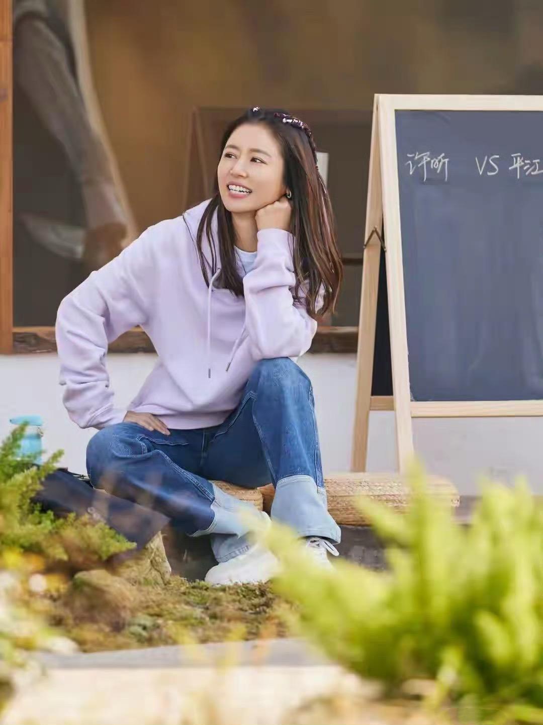 林心如穿淺紫色的衛衣,搭配了卷邊的直筒牛仔褲,那麼簡潔又很高級。高腰的直筒牛仔褲,配上一雙白色老爹鞋,大氣又顯高。