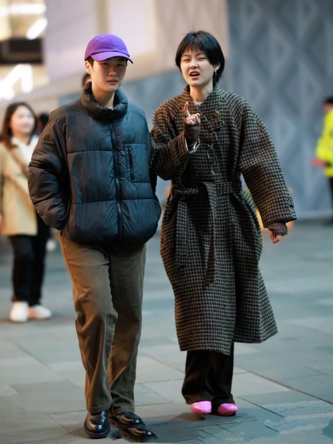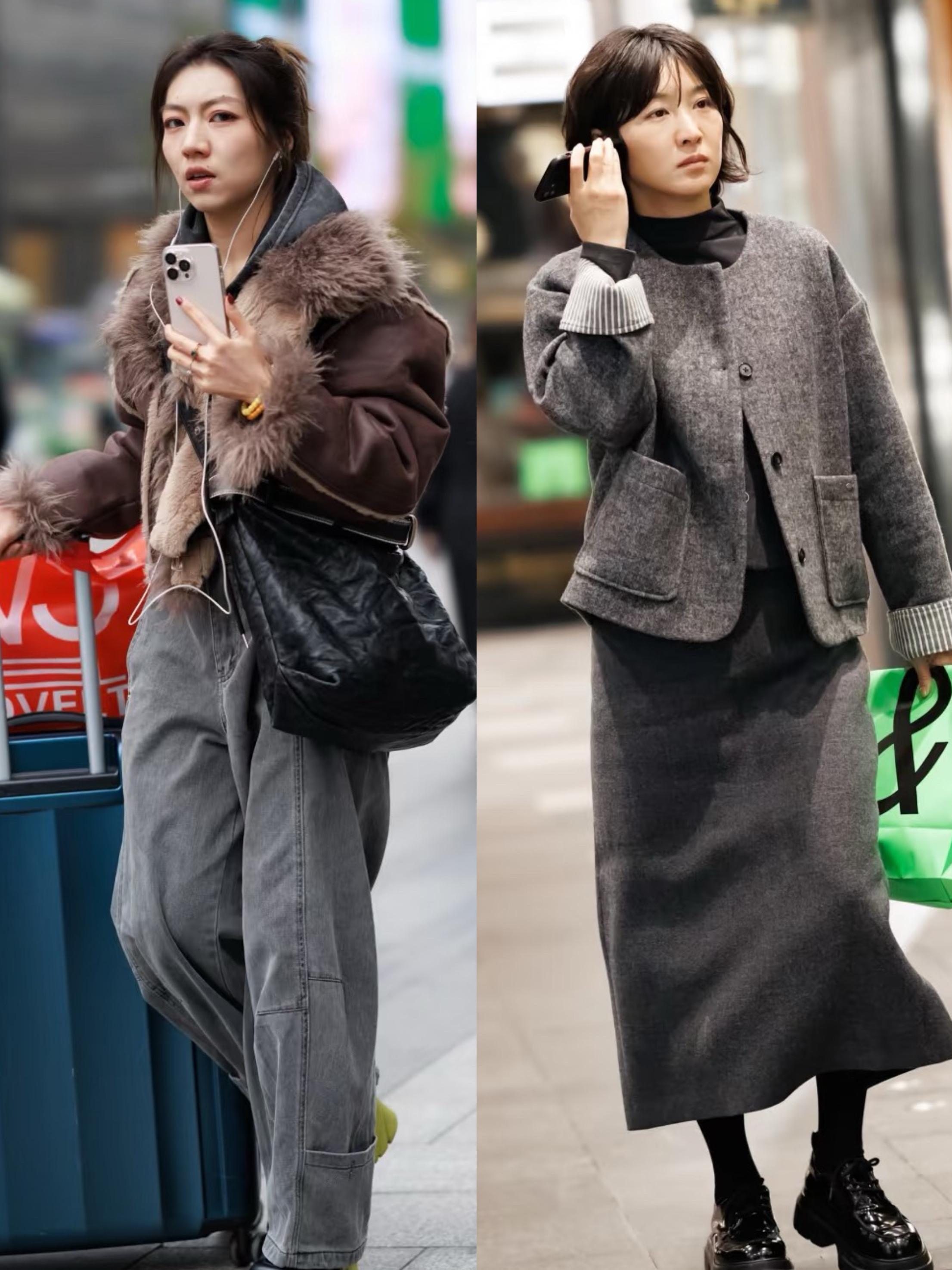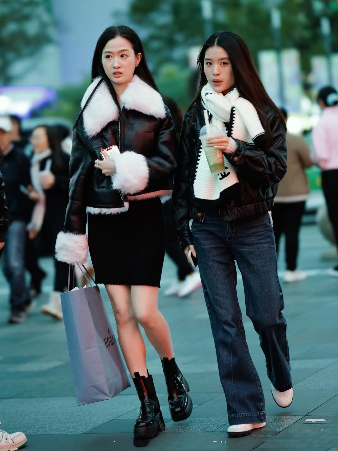 羊羔絨的外套、或者機車風的皮衣外套,比較板正的版型、也是幾年前的流行款了。不過在成都街頭,小姐姐們穿得好精緻。