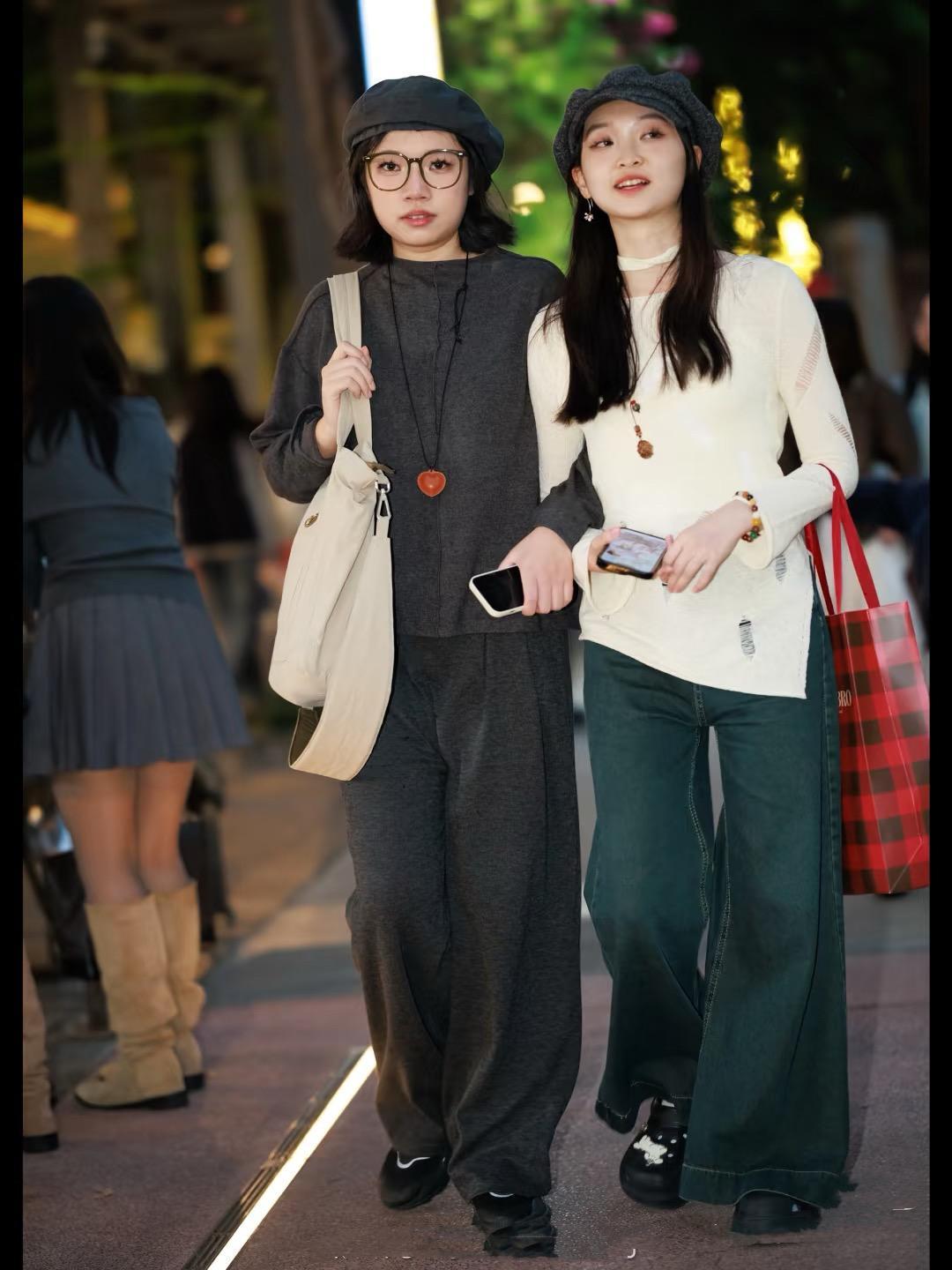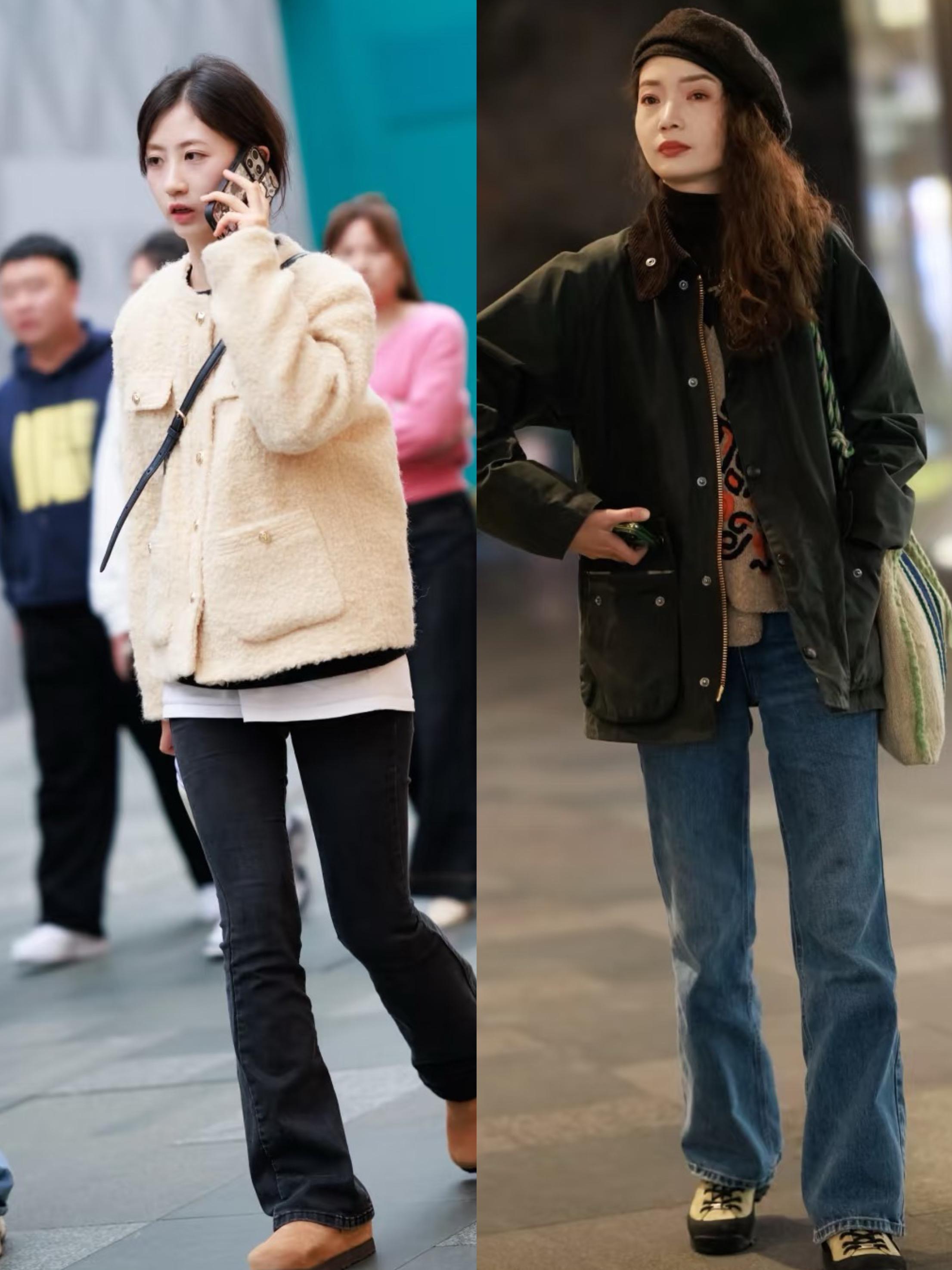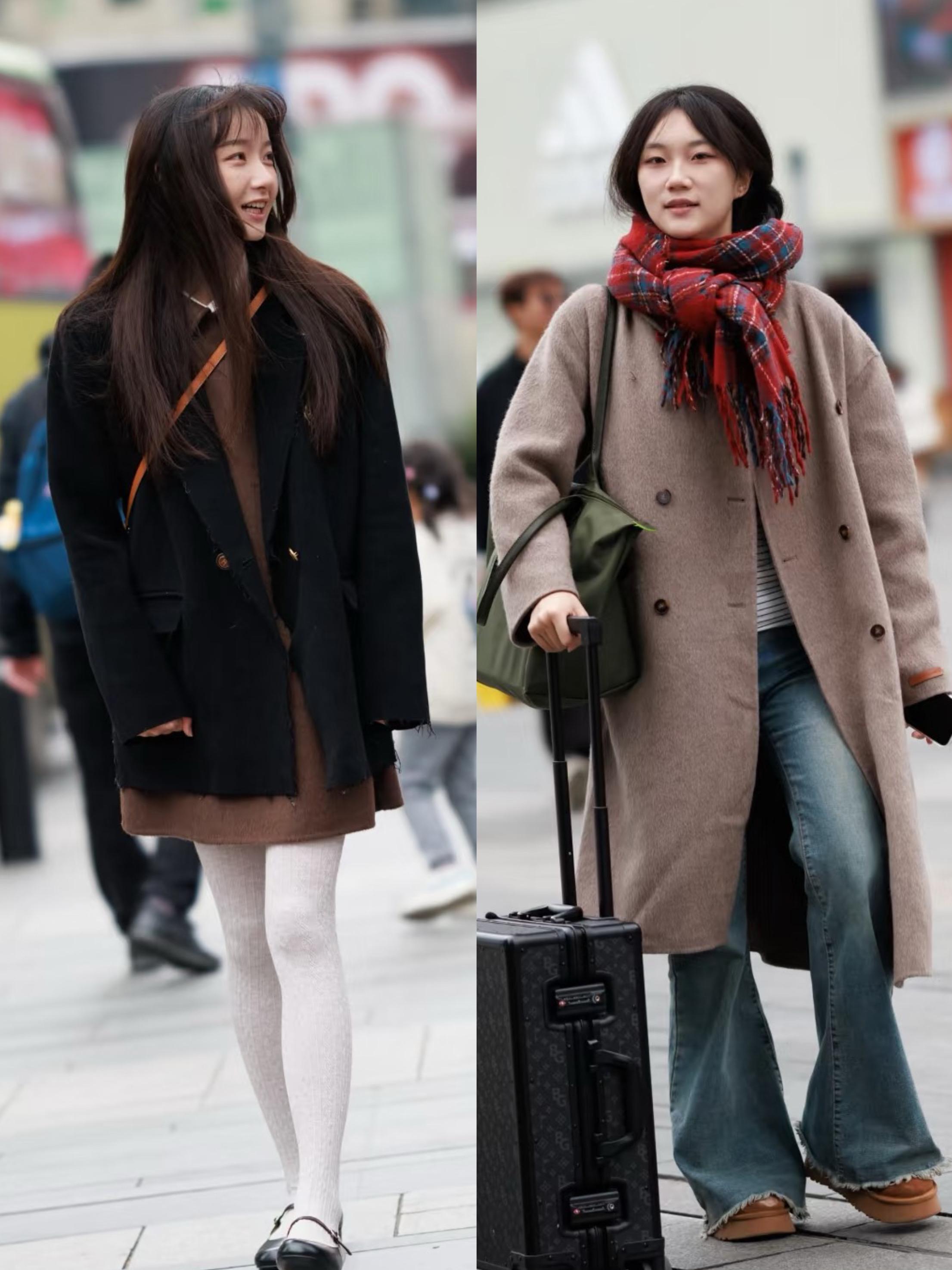 羊羔絨的外套、或者機車風的皮衣外套,比較板正的版型、也是幾年前的流行款了。不過在成都街頭,小姐姐們穿得好精緻。
