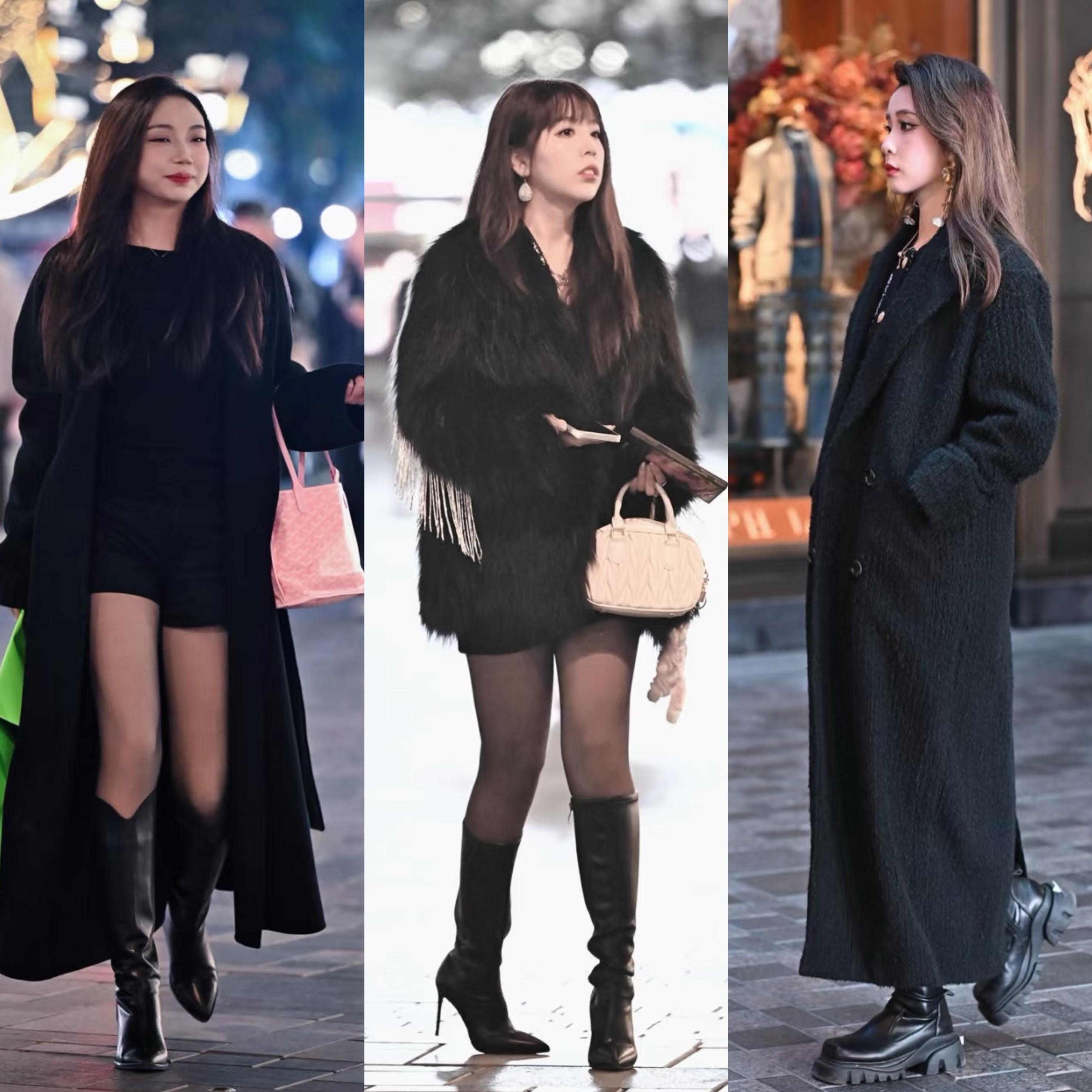 日常的穿搭裏,黑色大衣配上超短款的短裙或者短褲,都很養眼。沒有竹竿腿,稍微有點肉感的雙腿也更豐潤,配長筒靴有層次又很顯瘦。